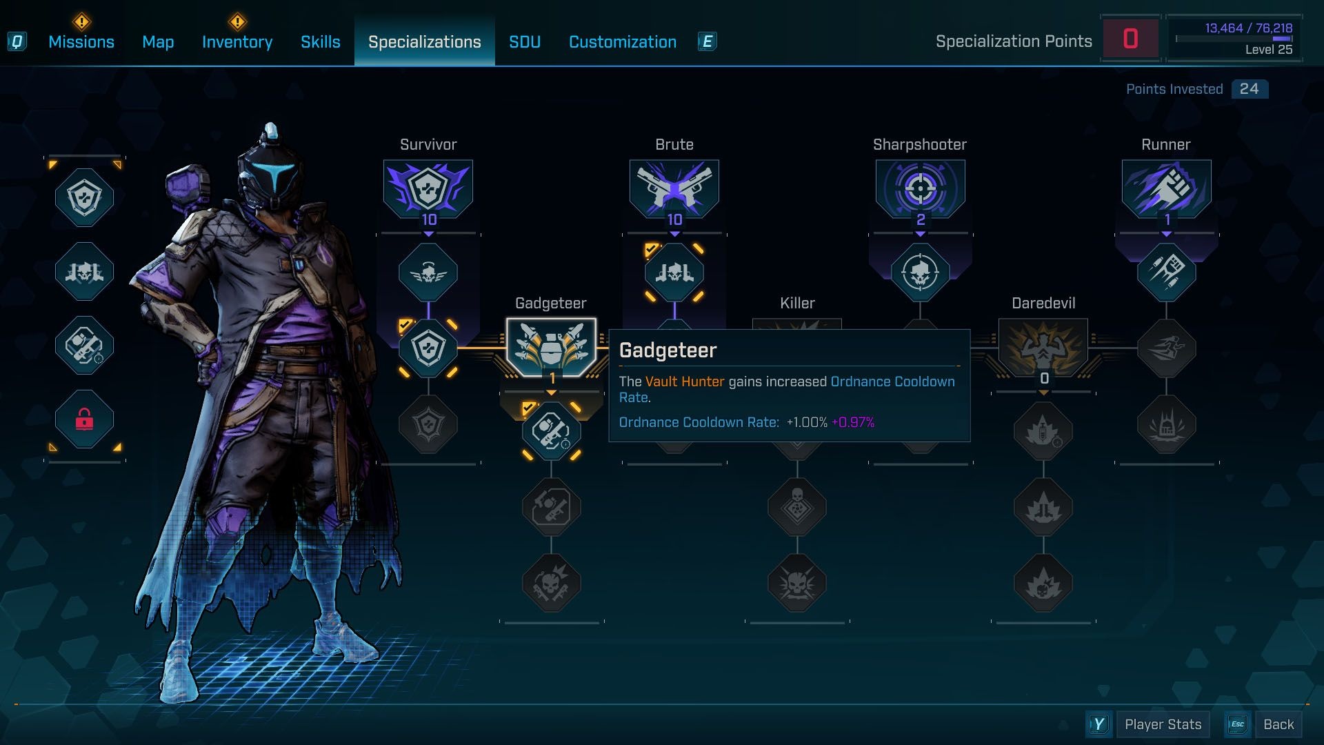 Wymaga: 10 punktów w Survivor i 10 punktów w Brute. Przydatny dla postaci opierających się na ordnance, czyli granatach i innej technice — skraca cooldowny ordnance za każdy punkt.