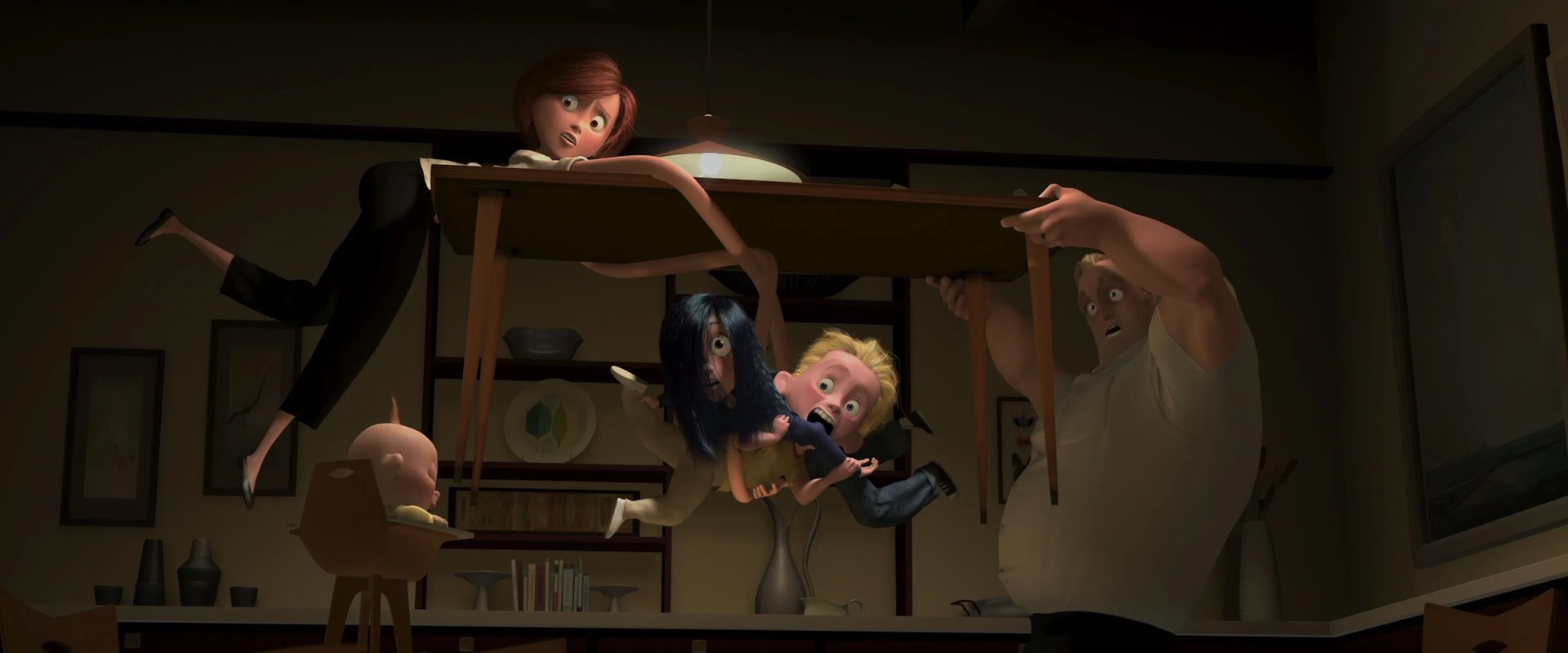 The Incredibles świetnie balansuje humor i powagę, co jest kluczowe dla sukcesu współczesnych filmów superbohaterskich. Film bawi się różnymi rodzajami humoru – od drobnych detali (jak francuski mim Bomb Voyage), przez meta żarty o superbohaterach, aż po postać Edny Mode i jej kultowe „No capes!”. Ten humor podkreśla dramatyczne momenty i sprawia, że film jest lekki i przyjemny do oglądania.