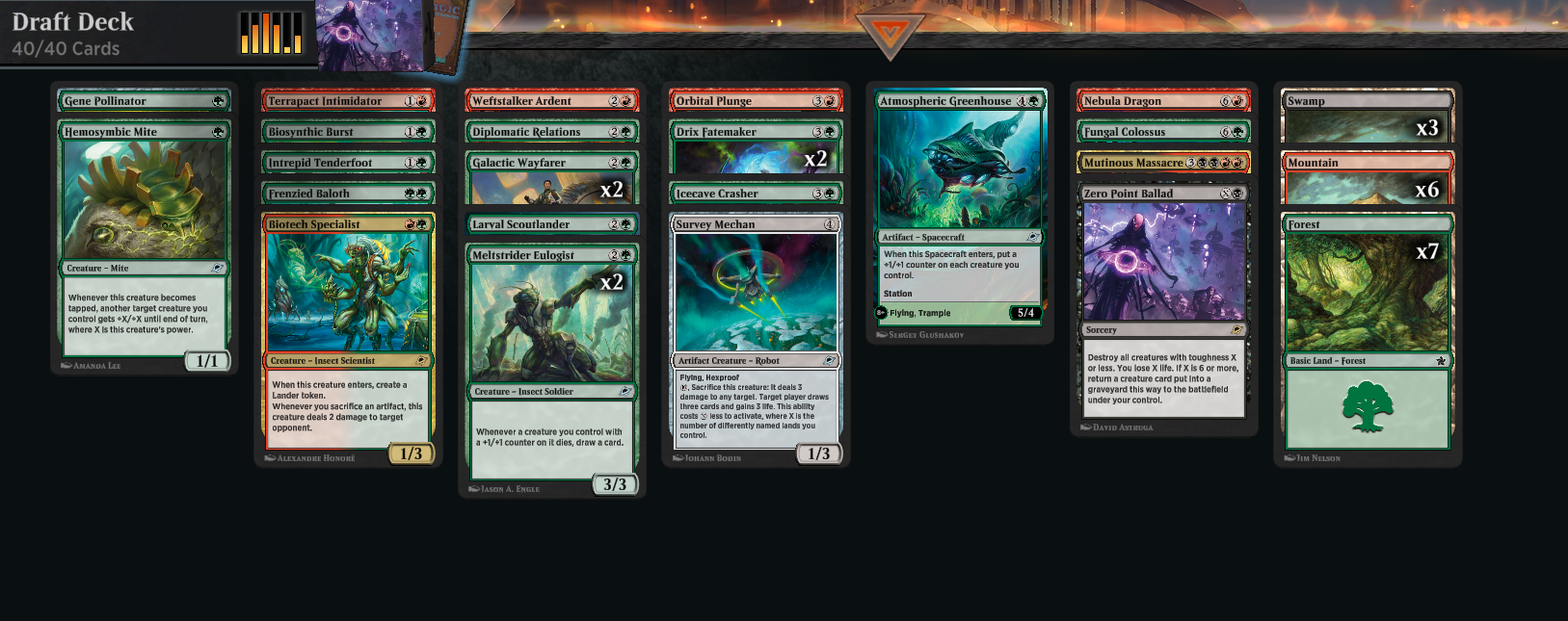 Dodatkowo zagrałem Draft i osiągnąłem 7-2, wybierając ponownie Red-Green z czarnym splash’em na karty takie jak Zero Point Ballad i Mutinous Massacre – ta ostatnia to prawdziwa bestia w Limited. Ta kombinacja kolorów i Lander tokens jako jedyny sposób na fixing many sprawdza się znakomicie.