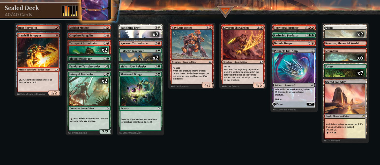 Po pierwszych grach w Sealed szybko zauważyłem, że tempo rozgrywki jest zdecydowanie szybsze niż w ostatnich dodatkach, takich jak Final Fantasy czy Tarkir: Dragonstorm. Tu nie ma mechanik pozwalających na odgrywanie kart z grobu, jak Flashback czy Harmonize, które zwykle ratowały przed tzw. floodingiem, czyli nadmiarem many na ręce. W Edge of Eternity wszystko kręci się wokół kontroli planszy – decydujesz, czy lepiej użyć tokenów Lander do rampy, czy rozbudowywać swoją obecność na stole, a także kiedy użyć Station na statkach kosmicznych i planetach, ryzykując odsłonięcie się na potężny atak przeciwnika.