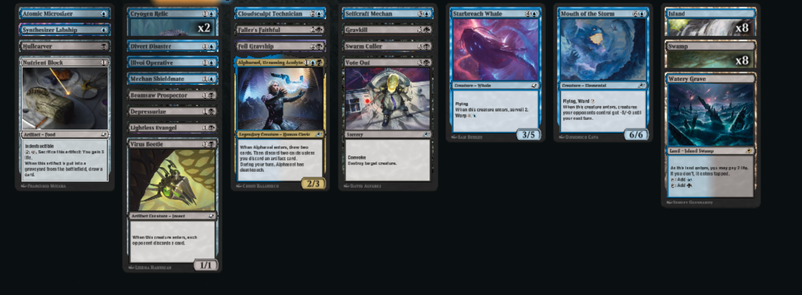 Ostatnia talia była według mnie najsłabsza – trzy ziemie w rare’ach i karty raczej nieprzydatne. Mimo to, Blue-Black poradziło sobie całkiem nieźle (4-0 w momencie pisania), głównie dzięki dobrej zdolności dobierania kart i solidnemu removalowi.