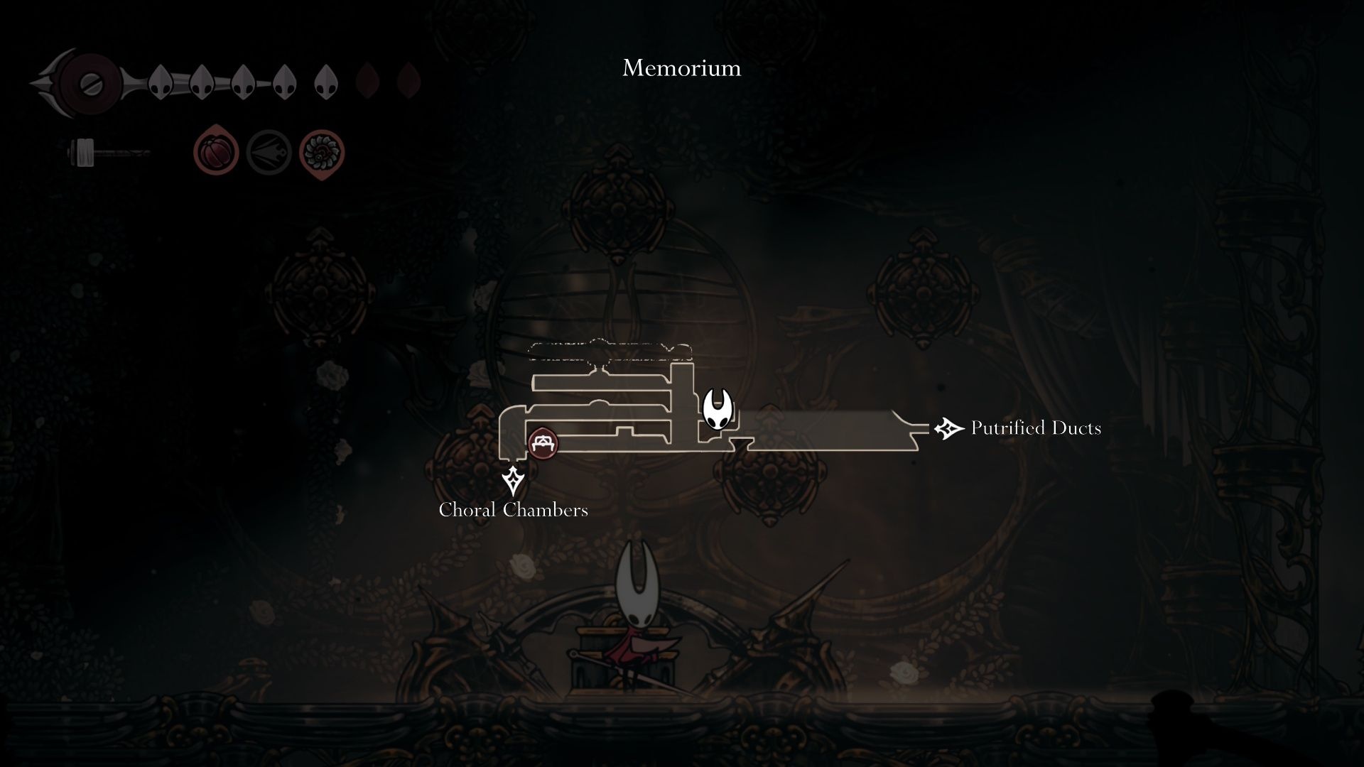 Memorium wymaga użycia *Faydown Cloak*, bo trzeba wykonać podwójny skok na wysoką platformę. Wejście do sali z dzwonkami jest po prawej stronie, nad hallem z mapą Memorium i sekretną ścieżką prowadzącą do Putrified Ducts.