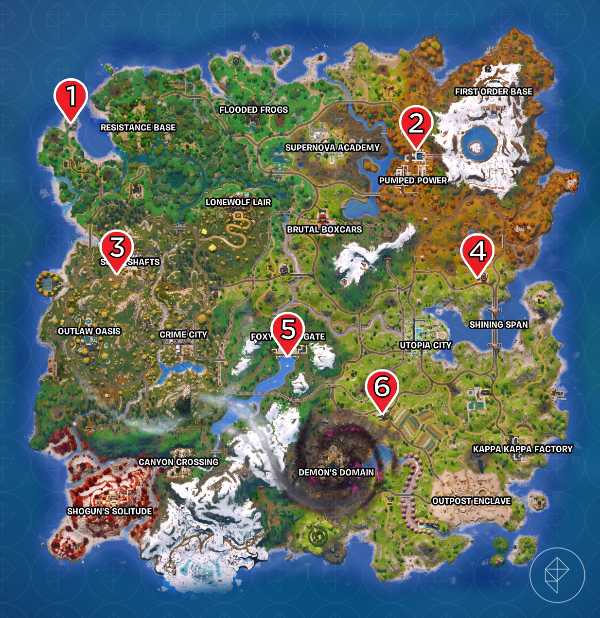 Na mapie Chapter 6 Season 3 jest sześciu wynajętych bohaterów, rozsianych w różnych miejscach. Oto dokładne lokalizacje: