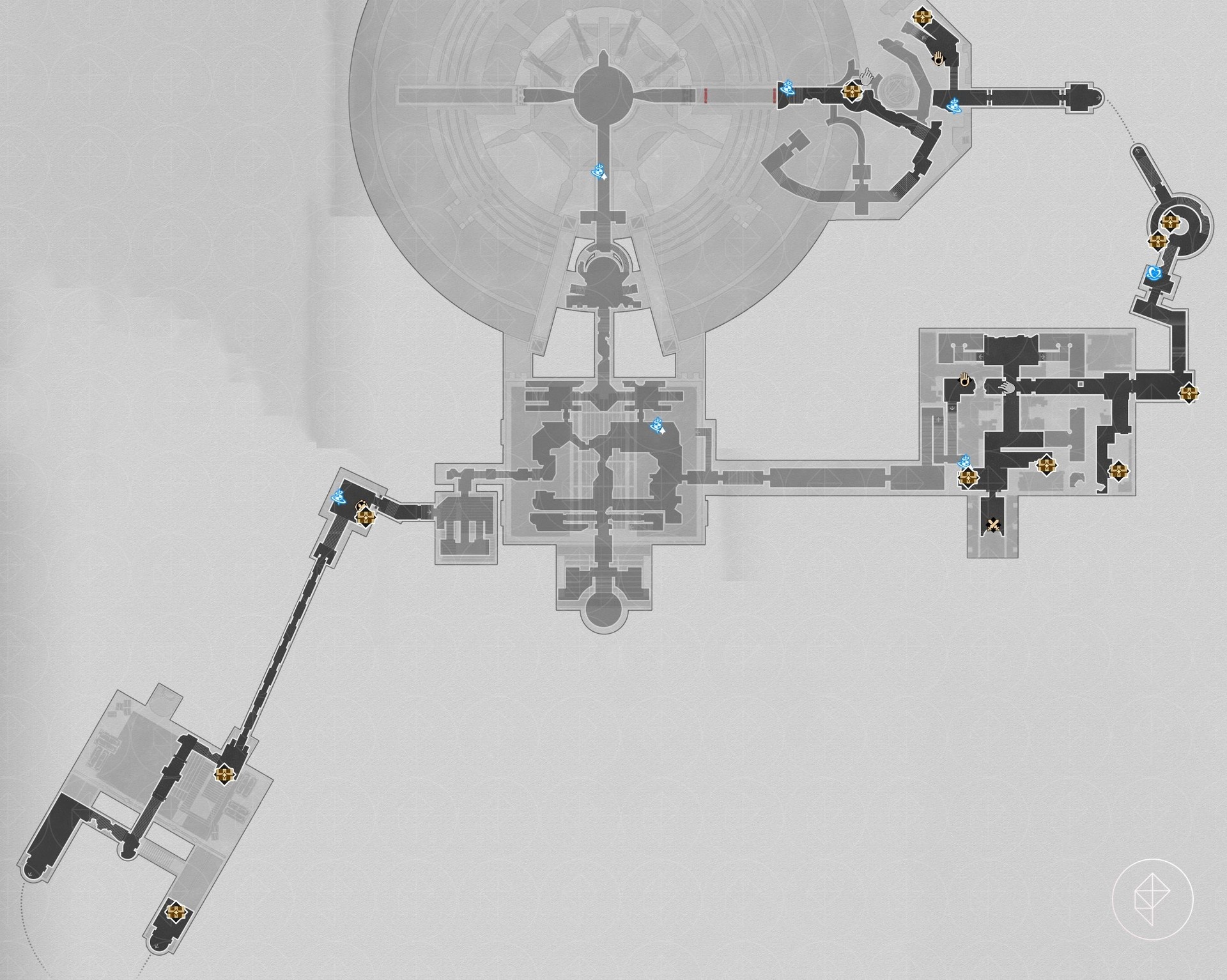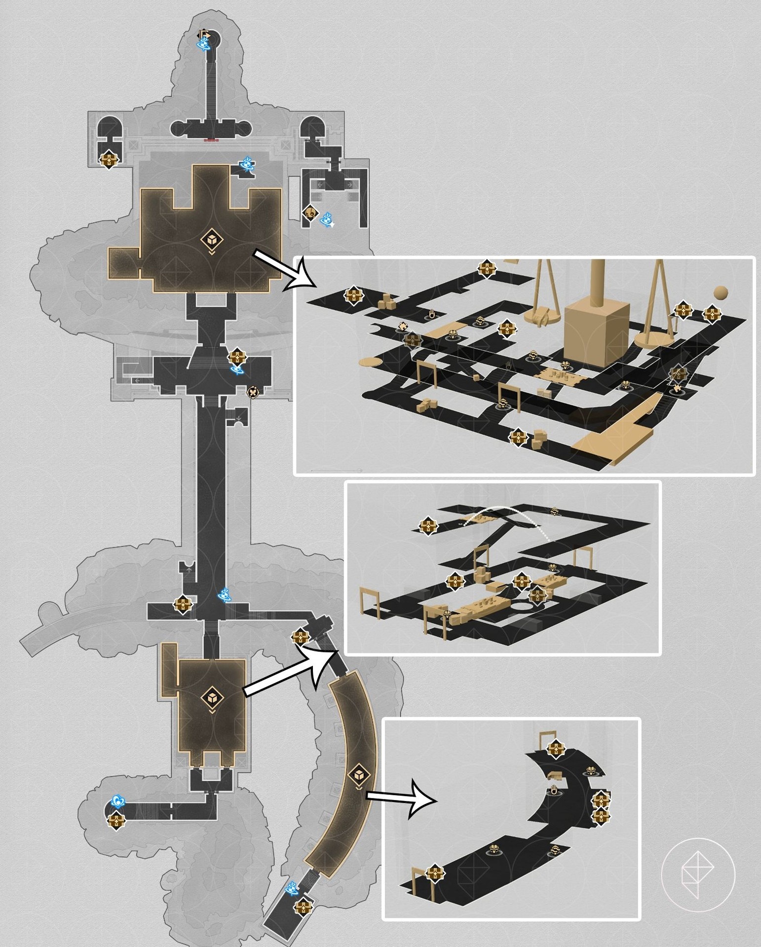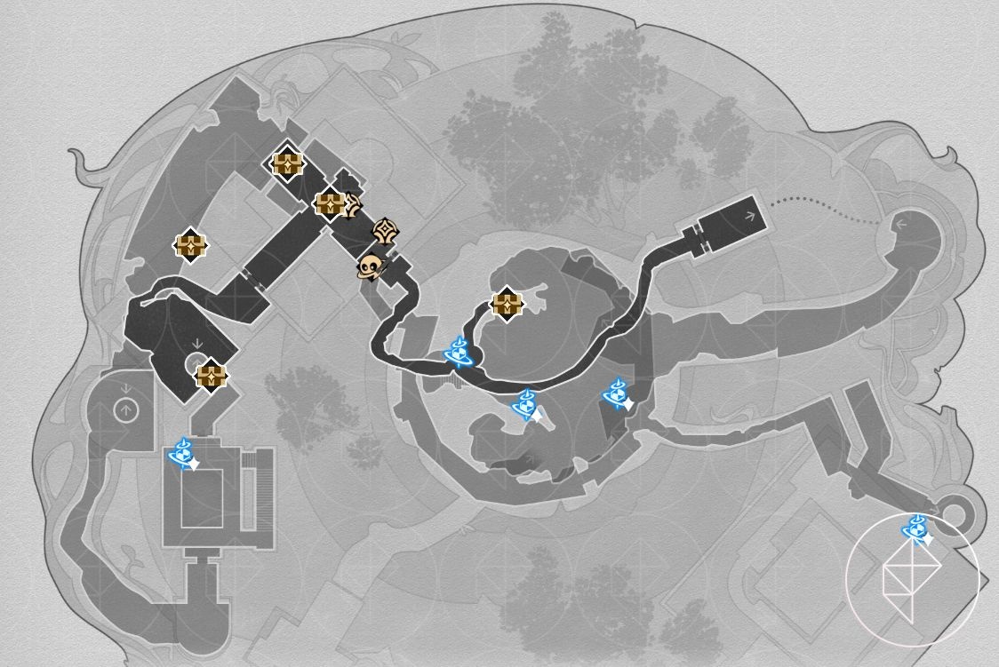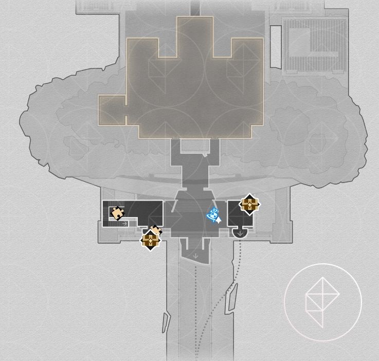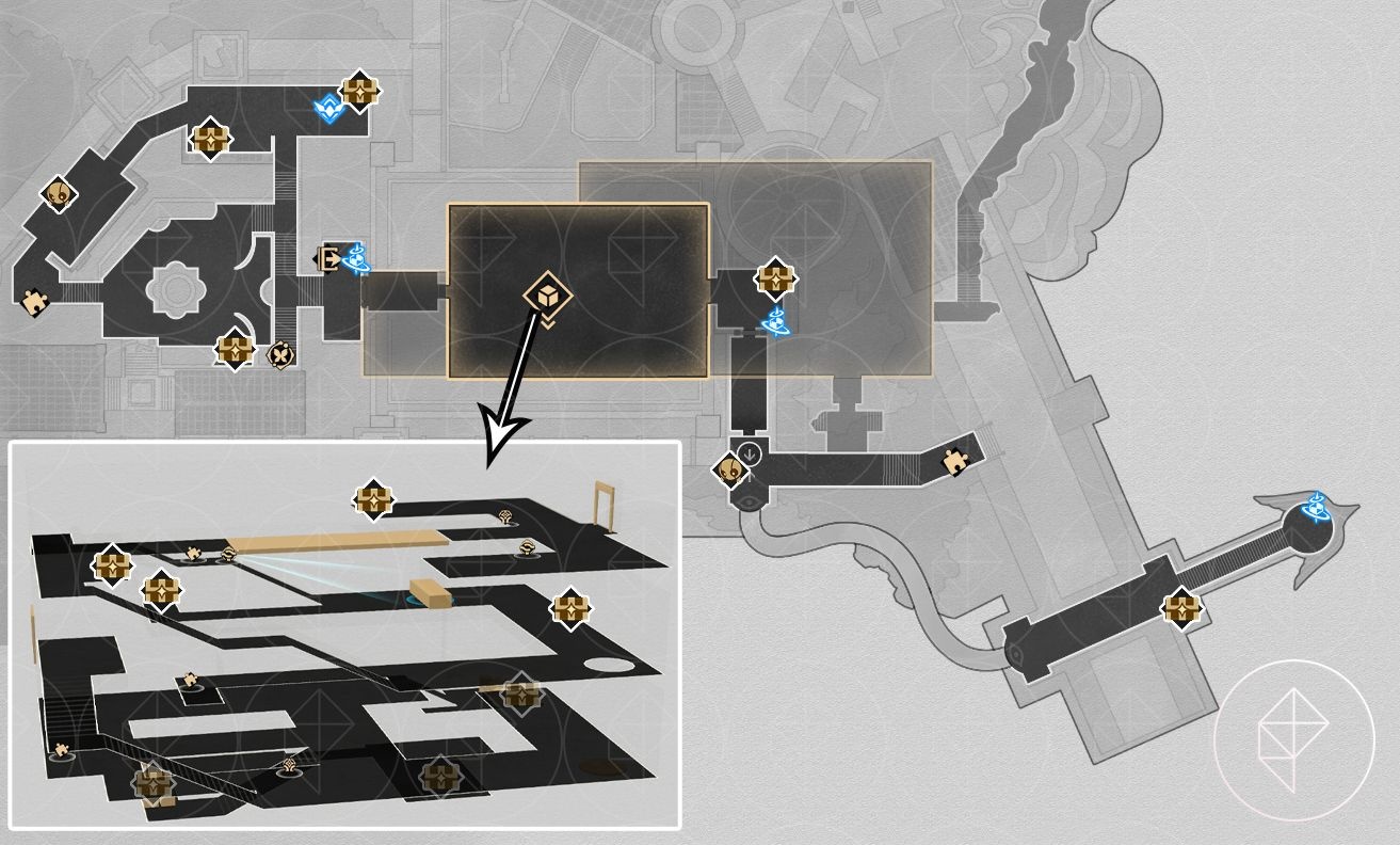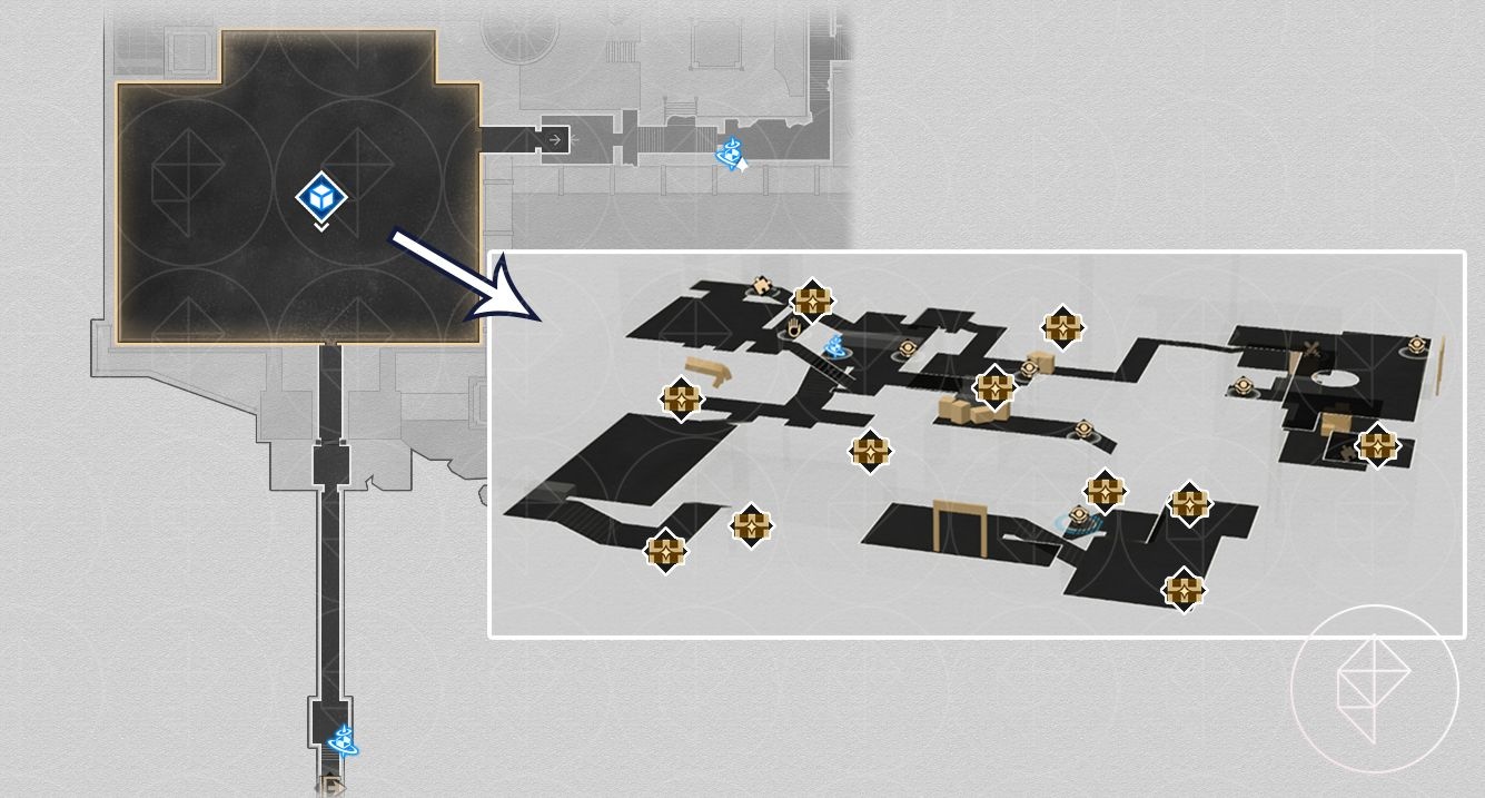 Ta lokacja ma kilka poziomów, a część skrzyń znajduje się w pokojach 3D. W północnej, okrągłej sali B1 jest sekretna winda, która daje dostęp do czterech skrzyń po wykonaniu zadania pobocznego I Once Was in Arcadia.