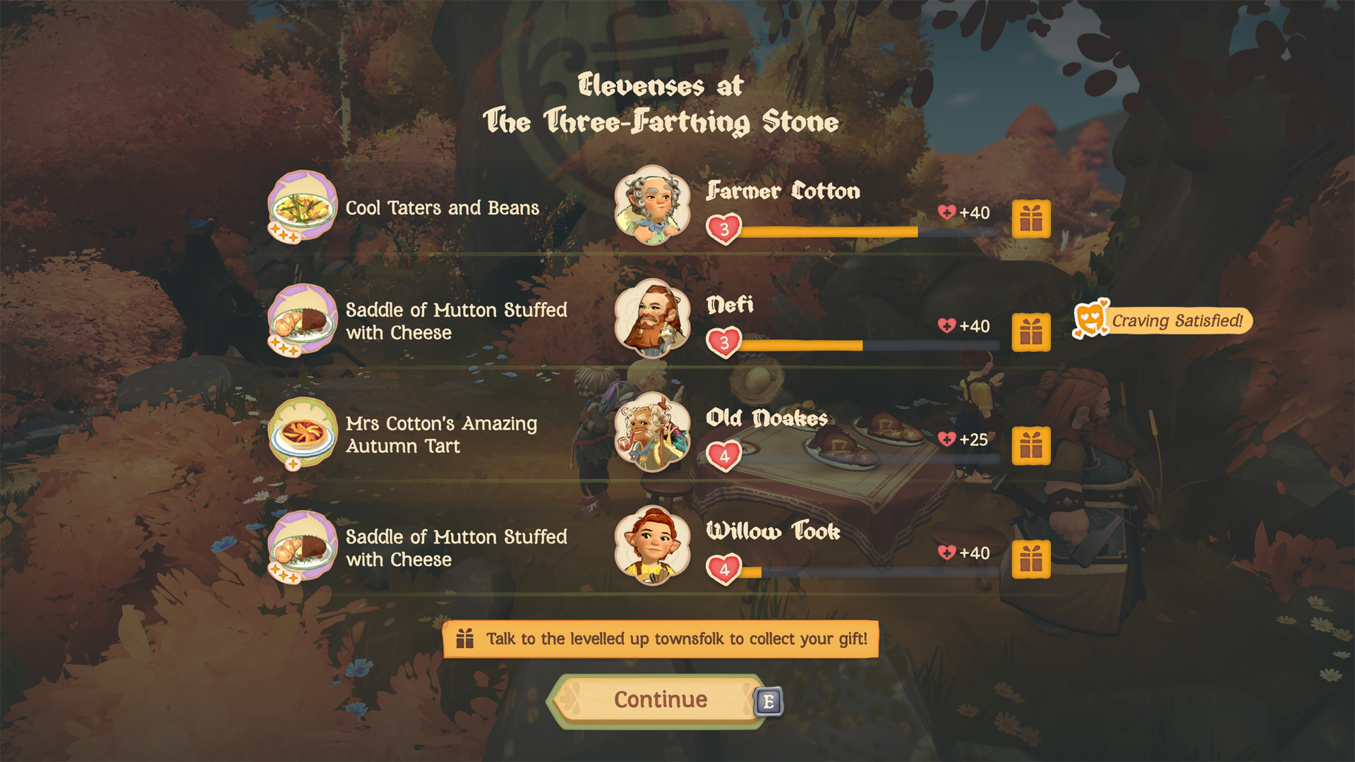 Po każdym wspólnym posiłku pamiętaj, by porozmawiać z zaproszonymi Hobbitami i odebrać swoje prezenty. W Tales of the Shire jedzenie to klucz do mebli i nowych możliwości!