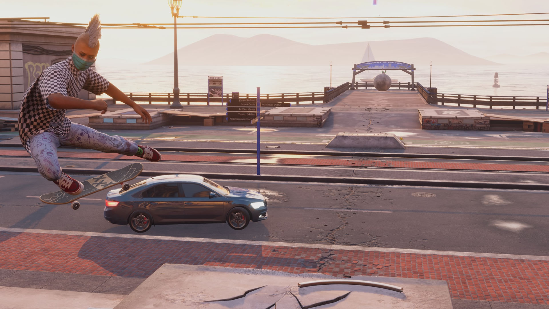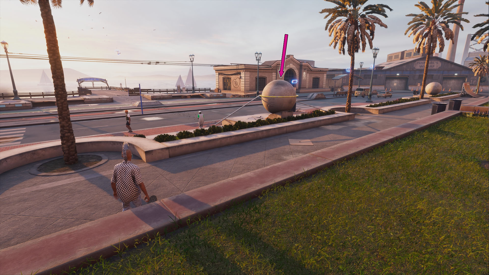 Najlepiej zatrzymać się obok głazu, zwrócony twarzą w stronę mola, wykonać ollie, a następnie wallplant. Jeśli chcesz ułatwić sobie zadanie, zmień w ustawieniach sterowania opcje wallplanta, tak aby przycisk do ollie służył też do wallplanta (np. na PlayStation 5 jest to przycisk X). Dzięki temu wystarczy nacisnąć ten sam przycisk dwukrotnie – raz na ollie, a zaraz potem na wallplant.
