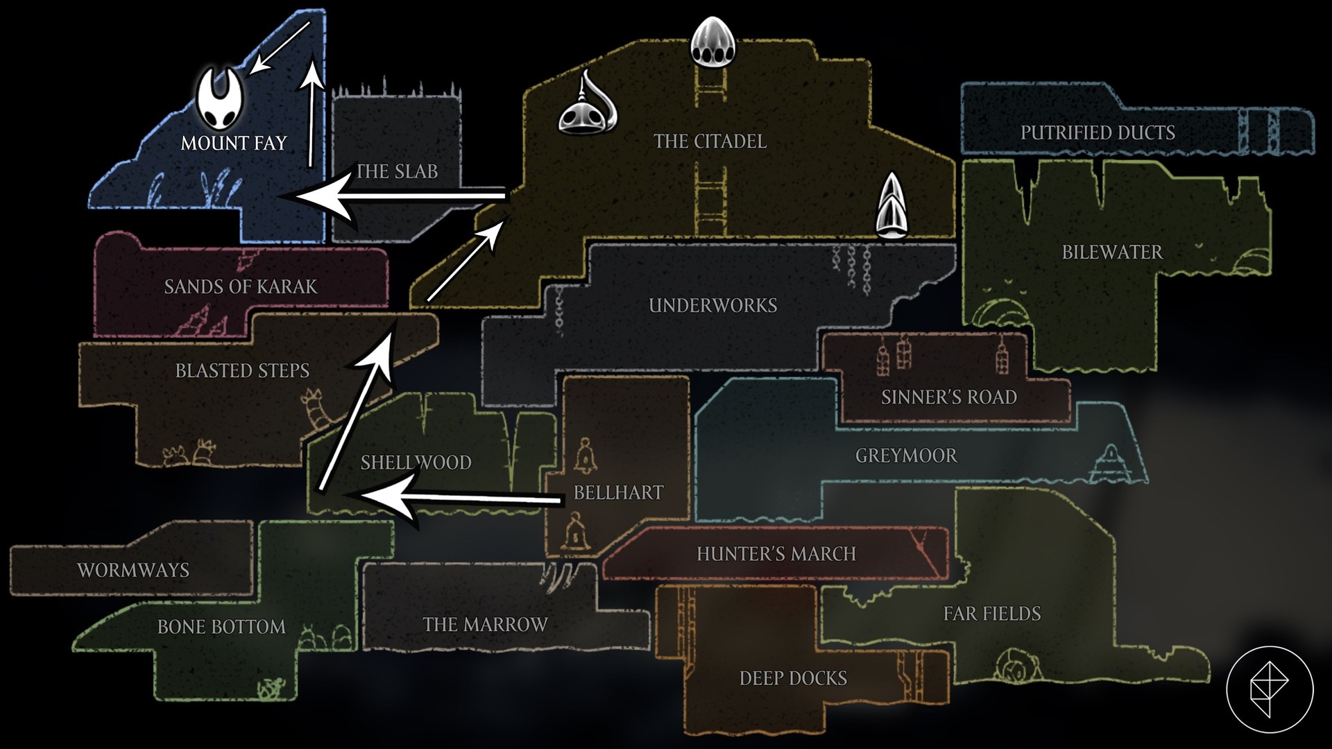 Trasa, którą polecamy, prowadzi z Bellhart przez Shellwood i Grand Gate, a następnie przez The Slab do Mount Fay. Poniżej krok po kroku: