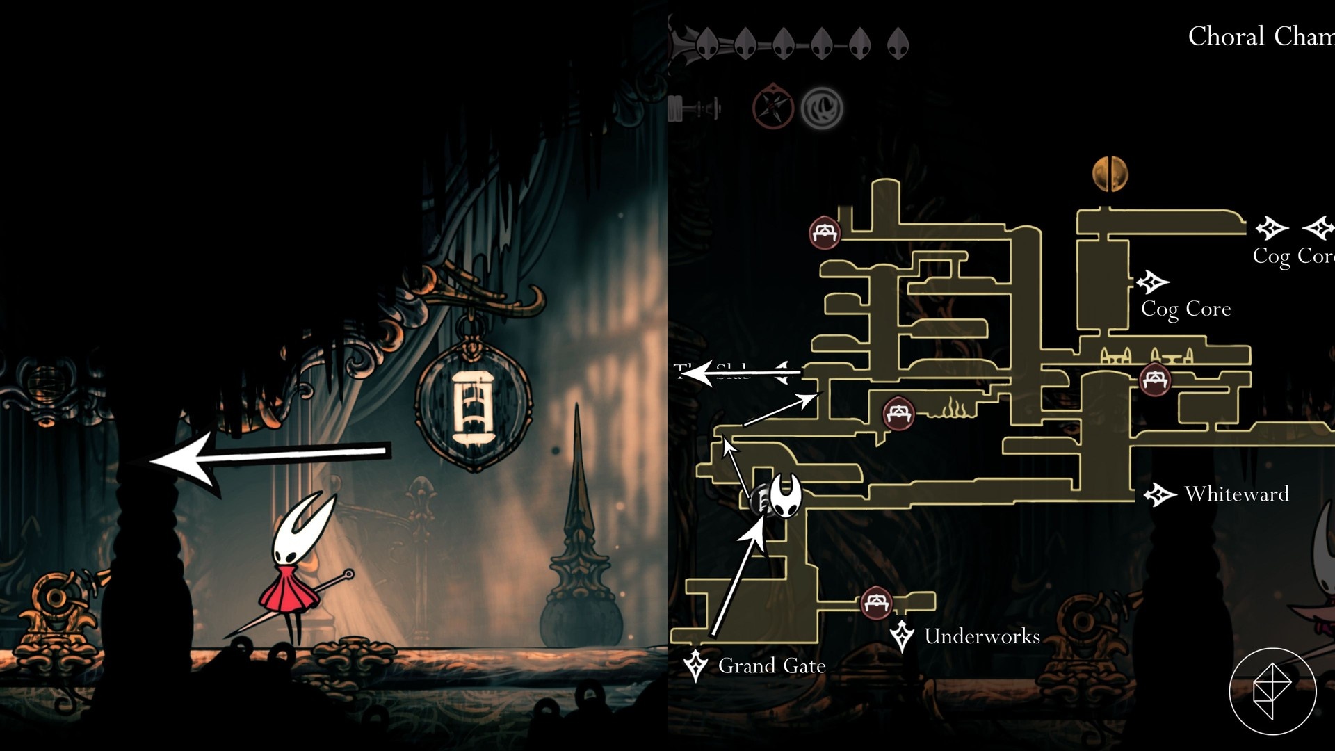 - Idź na wschód do dużej sali z platformami na wagę. Wskocz na balkon w prawym górnym rogu i uderz w ścianę, aby odsłonić sekretne przejście — pójdź w górę i uderz sufit, by wejść do Choral Chambers. Trzymaj się lewego brzegu przy wspinaczce.