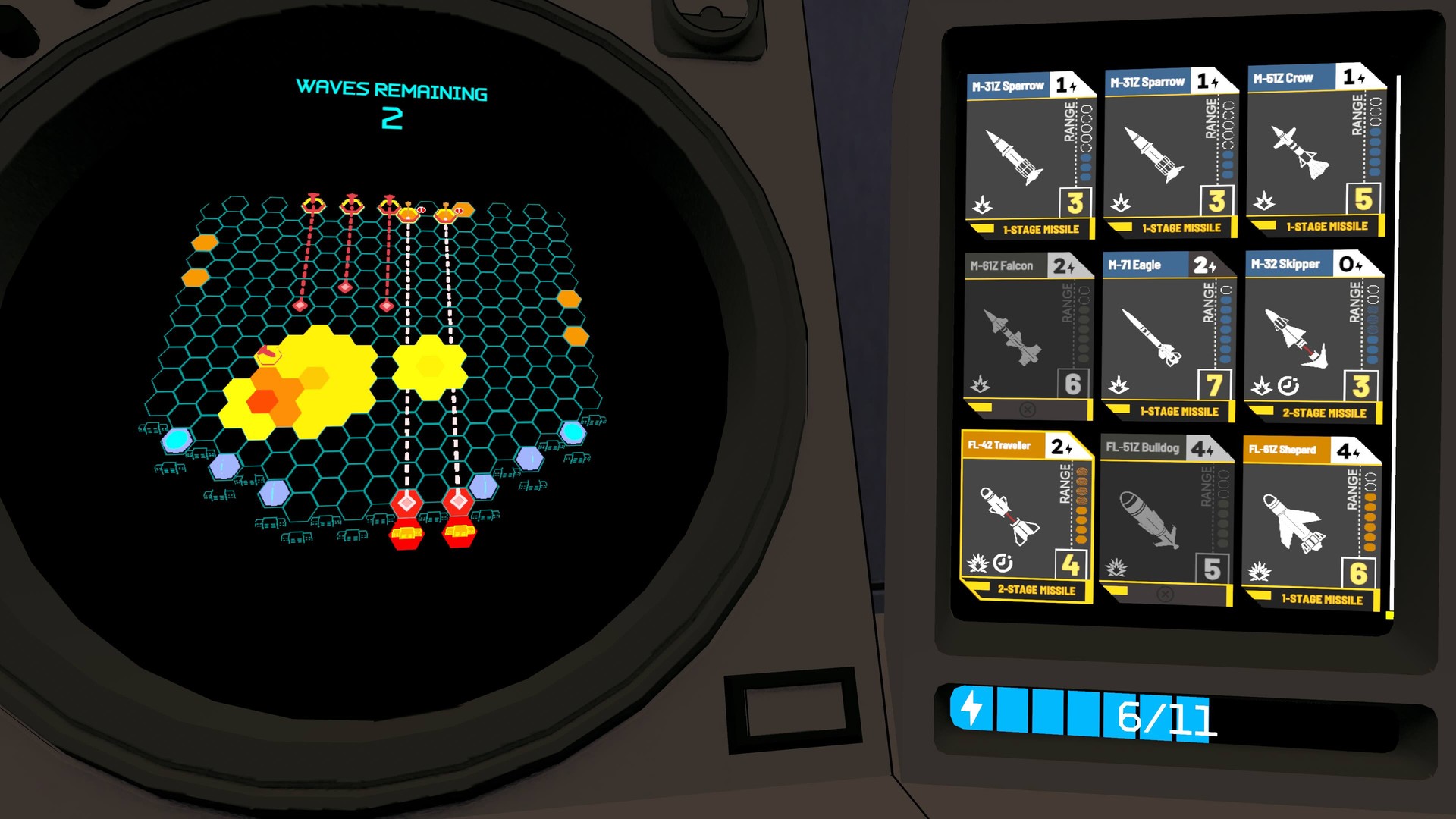 Każda tura to analiza trajektorii wrogich pocisków i wybór do trzech własnych rakiet, które różnią się zasięgiem, kosztami energii i sposobem detonacji. Niektóre wybuchają natychmiast, inne wymagają dwóch tur, by stworzyć efektowną eksplozję na siedmiu heksach, niszczącą wszystko w zasięgu. Ta mechanika działa znakomicie zarówno w misjach treningowych, jak i podczas prawdziwych ataków, oferując wymagające i satysfakcjonujące wyzwania.