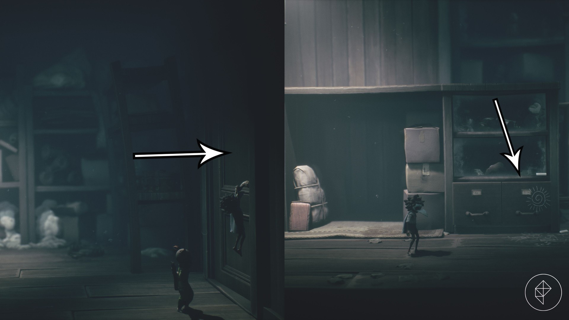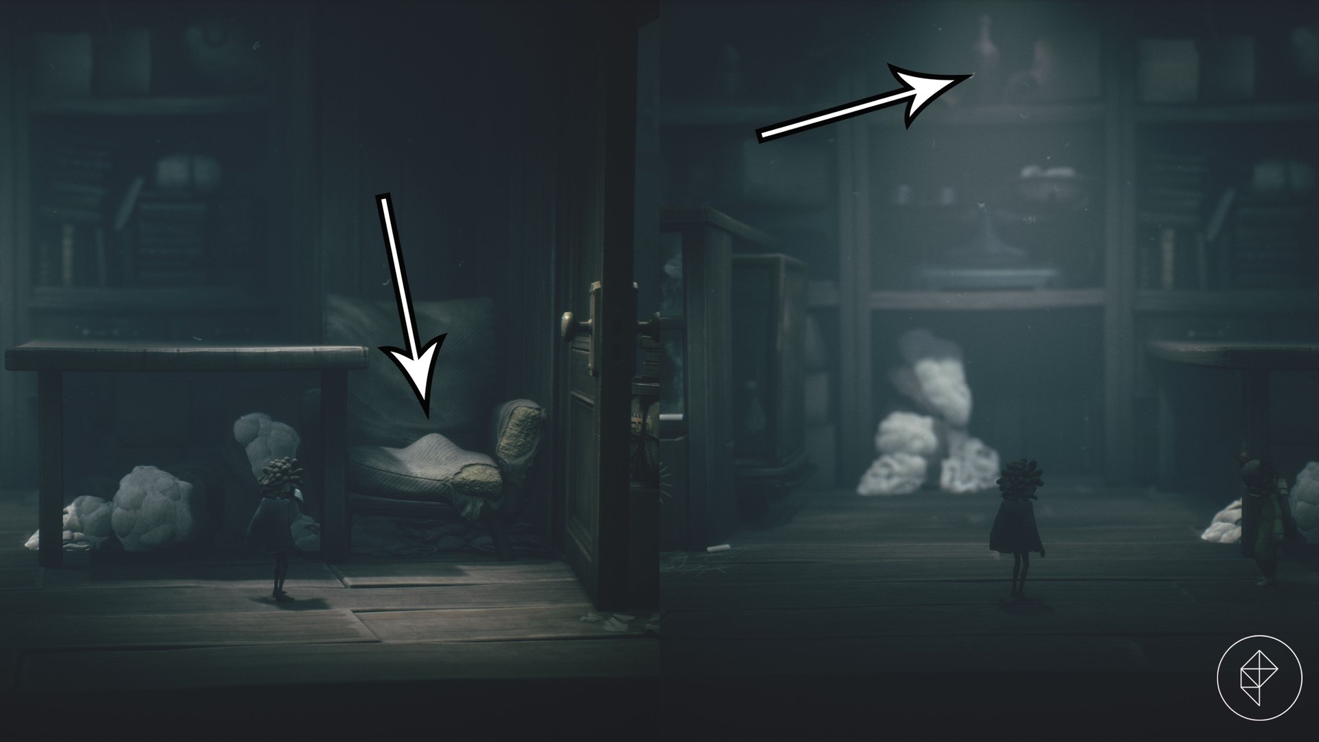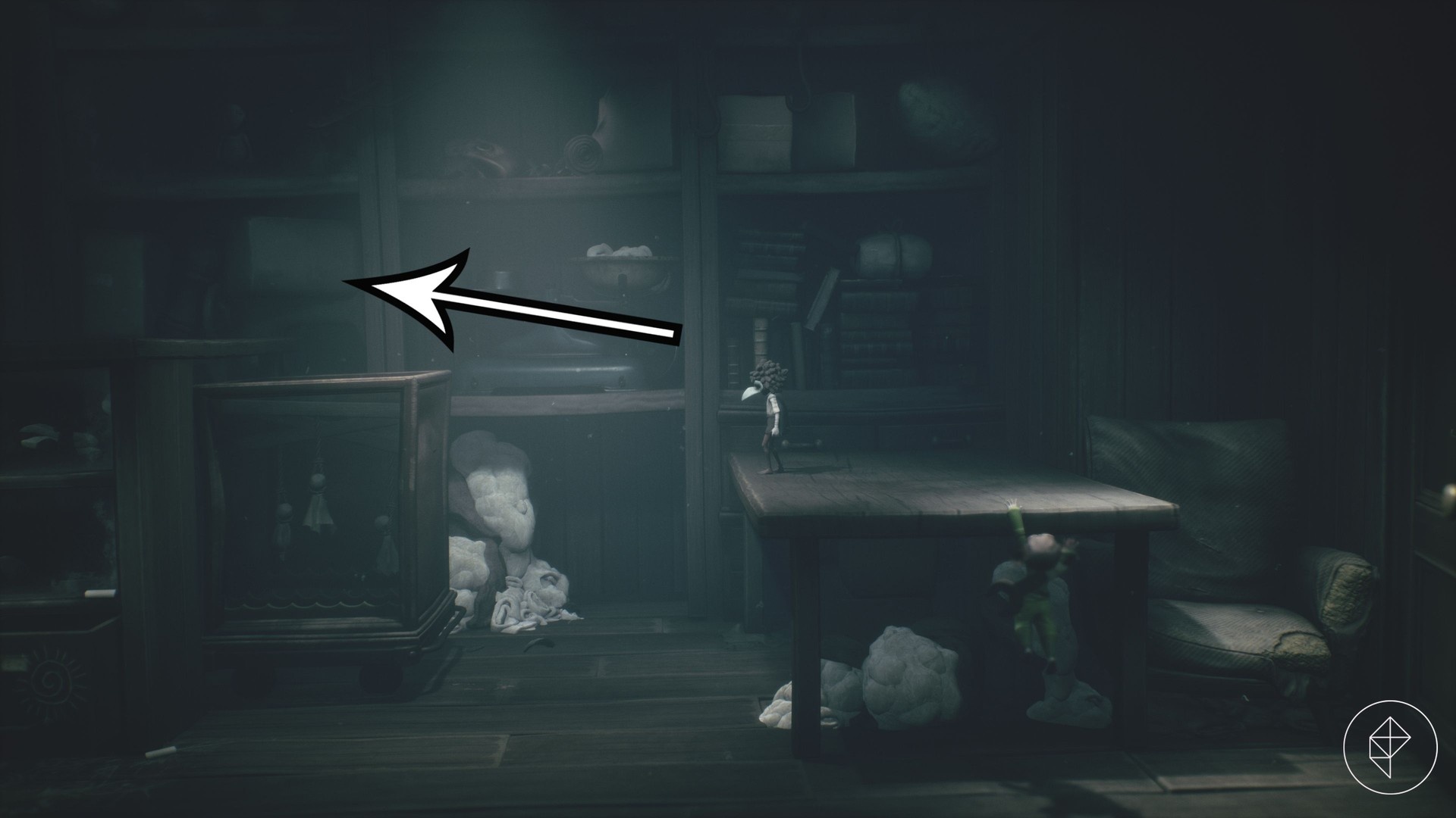 Przepaść między wózkiem a stołem może wyglądać na zbyt szeroką, ale jeśli chwycisz wózek i wspniesz się, skok jest wykonalny. Wspinaj się drabiną i podążaj korytarzem wentylacyjnym. W końcu dojdziesz do miejsca z kilkoma drogami: na lewo stoi nieaktywna winda bez wtyczki żarówki, na prawo jest szyb z tłuczonym szkłem (znajdziesz tam lalkę kolekcjonerską), a prosto w ciemnym korytarzu czeka skrzat — idź za nim.