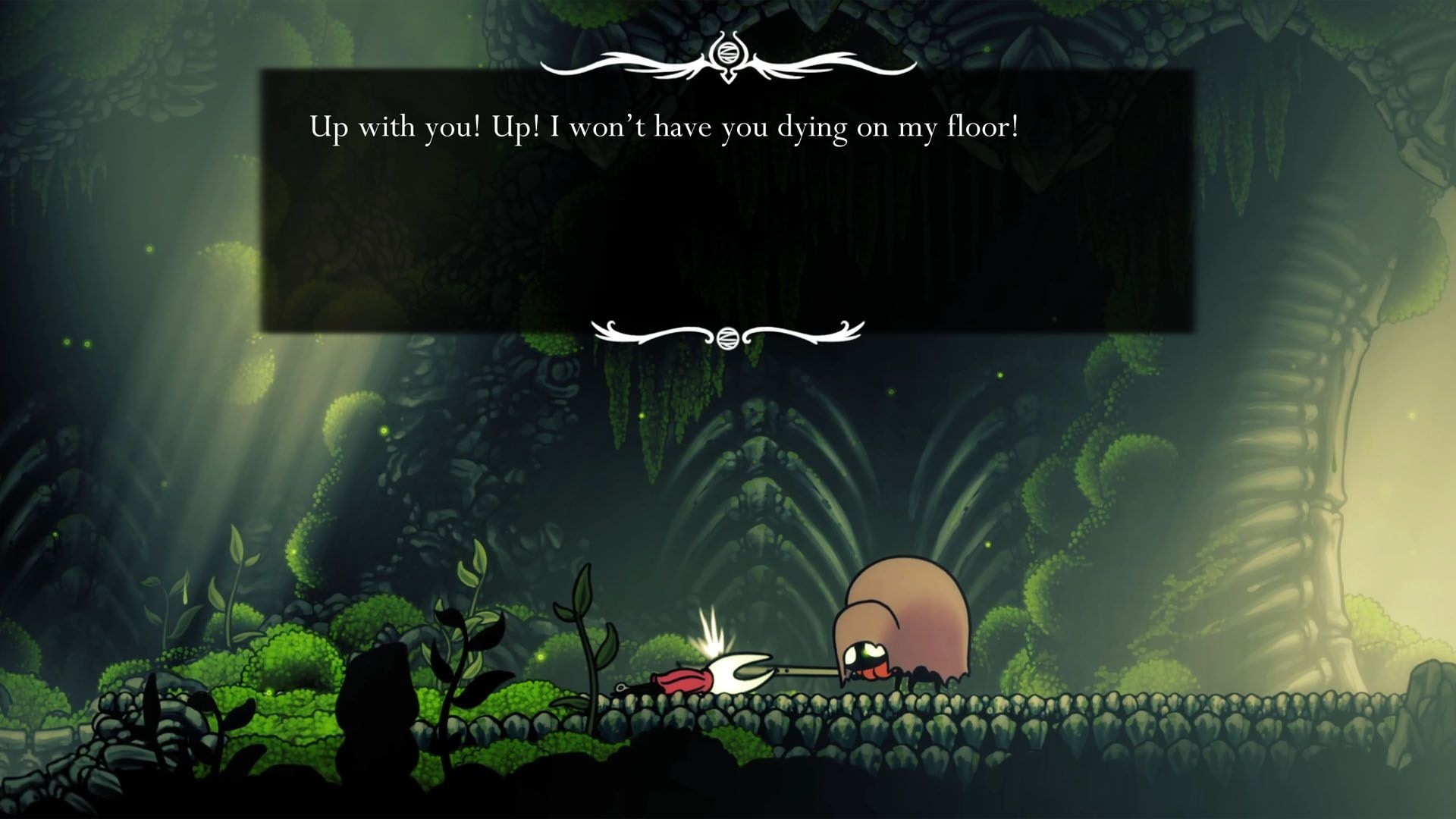 Po rozpoczęciu kampanii w Act 1 uciekasz z Moss Grotto i trafiasz do Bone Bottom. Tam odblokowujesz pierwszy punkt odpoczynku (bench) i uczysz się podstaw poruszania: atakiem w dół i skokami. Pierwszy wymagany boss, którego napotkasz, to Moss Mother — pokonanie jej otwiera drogę dalej.