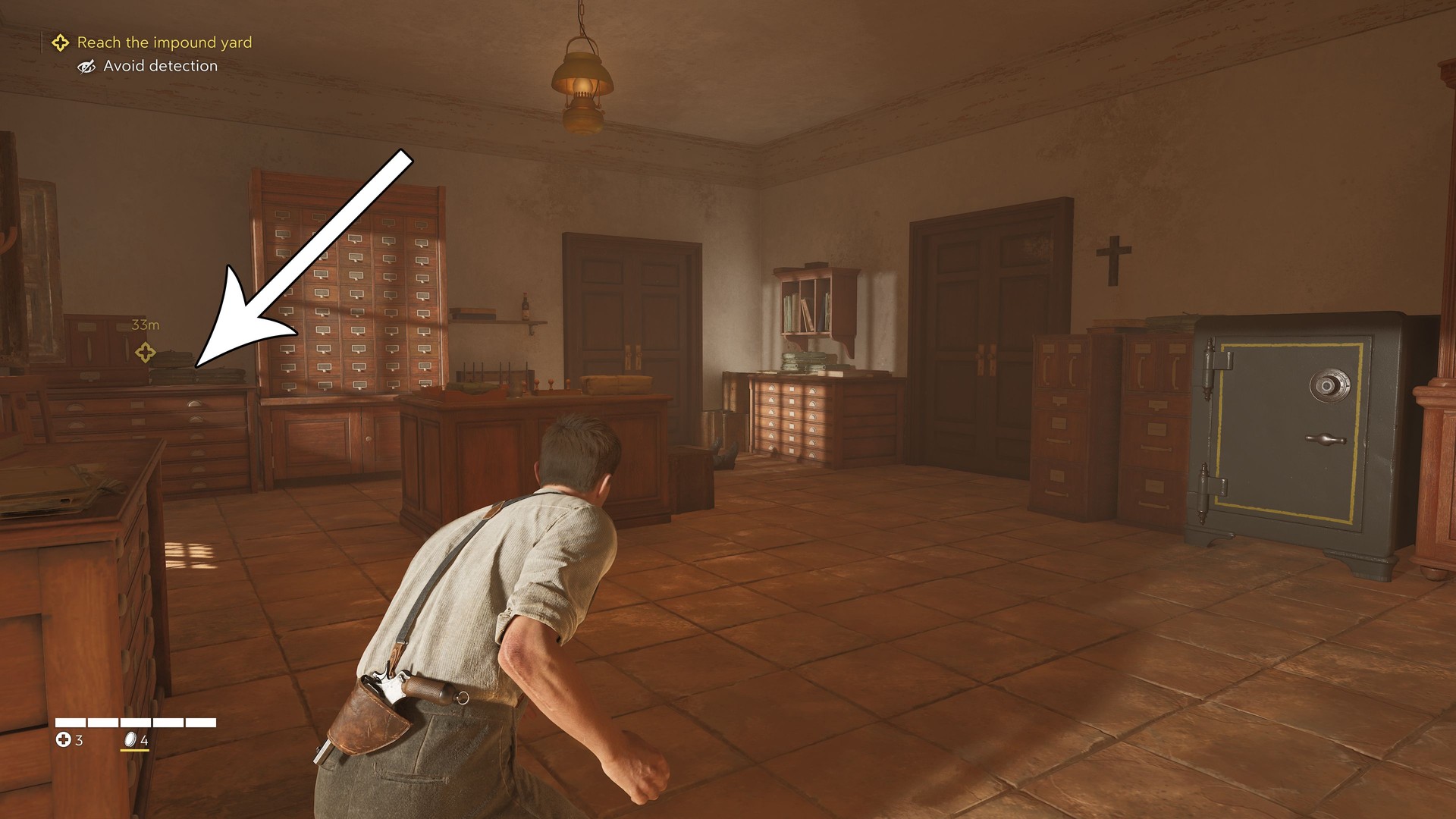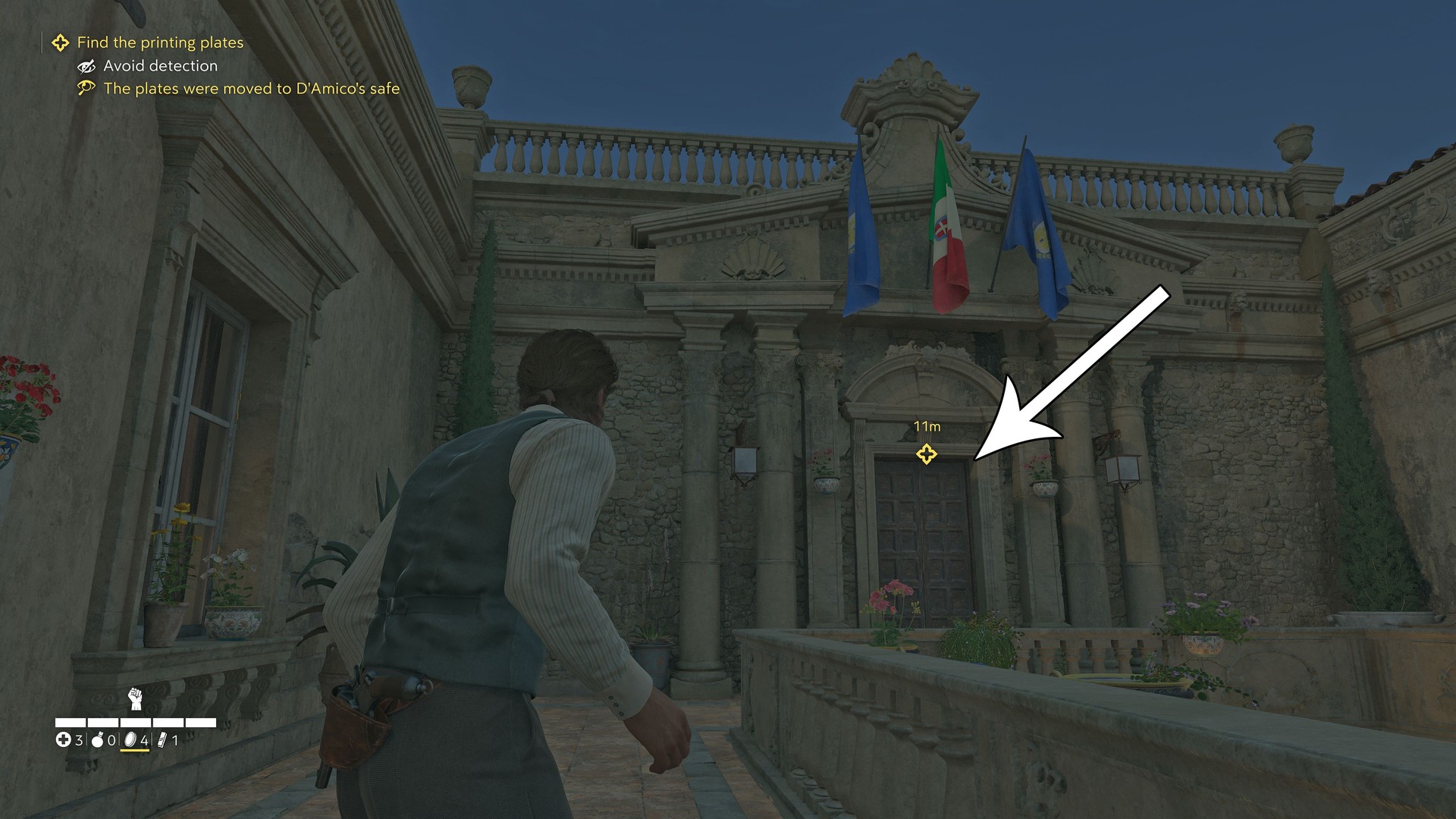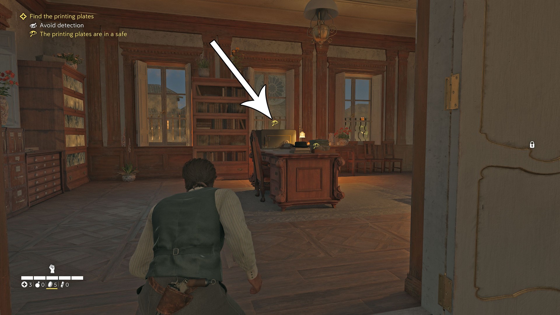 W środku czwartego sejfu znajdziesz wskazówkę, że płyty drukarskie są w sejfie D’Amico. Aby tam dojść, idź na górę, przejdź przez dziedziniec (uważaj na strażników), potem wejdź przez duże drzwi pod trzema flagami do biura D’Amico. Kod znajdziesz też na notatce na jego biurku.