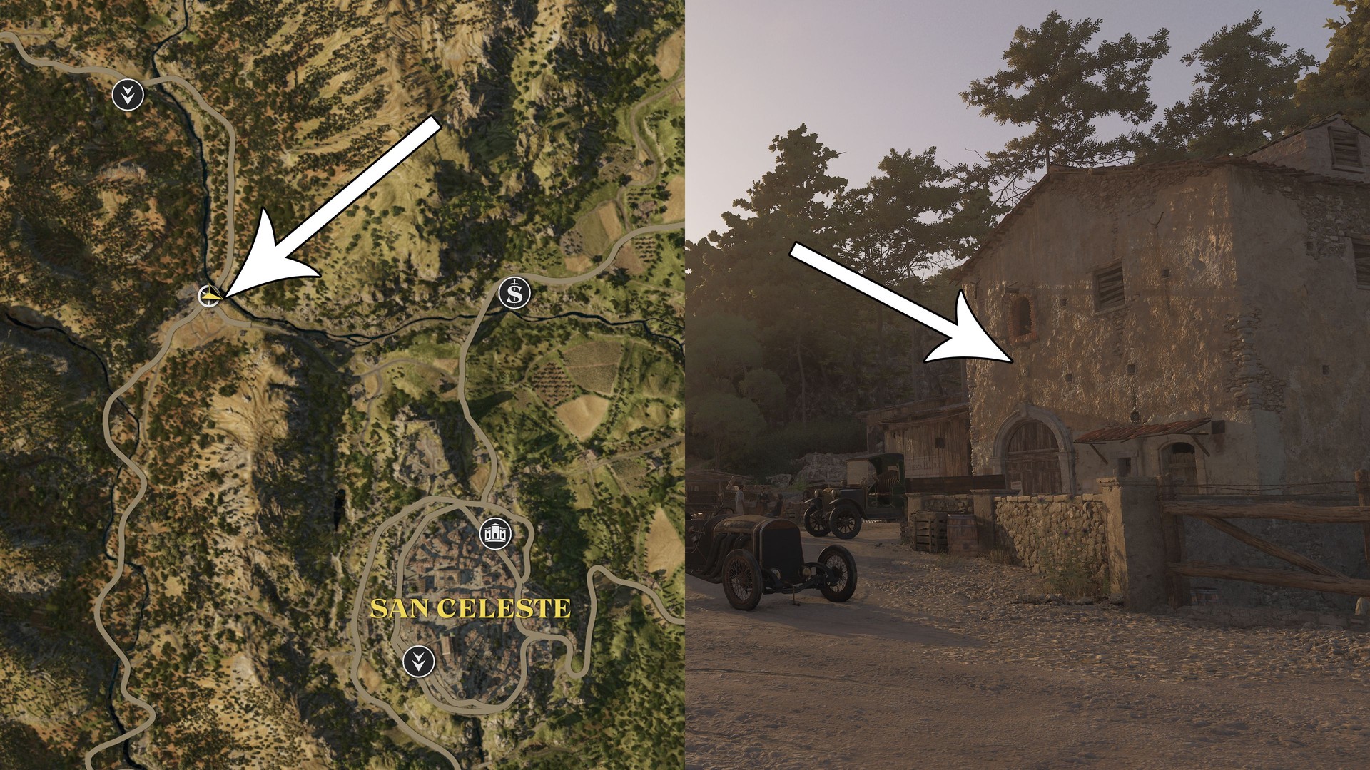 - Chapter 3 – Pizzu: Po walce z bandytami, wejdź do chaty na końcu misji; wyjdź tylnymi drzwiami i spójrz w stronę chaty — Trinacria nad drzwiami.