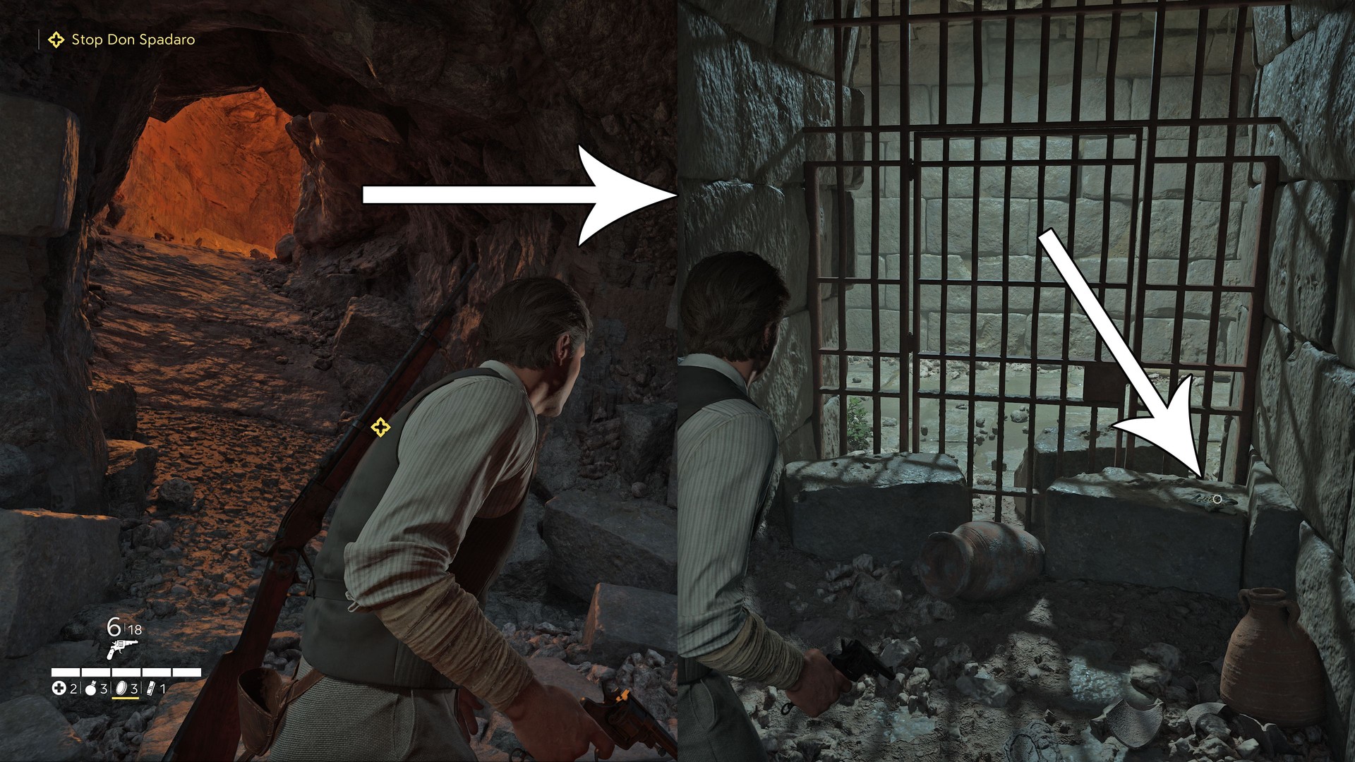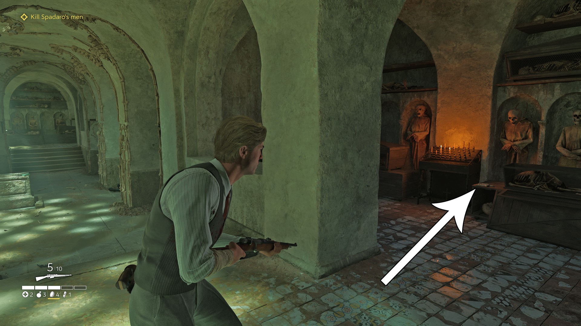 - Chapter 9 – Industria: W dużym magazynie, gdy szukasz wejścia do biura majstra: zamiast iść od razu do celu, skręć na wschodnią stronę i spójrz na kamienną ścianę za czerwonym pudłem Spadaro.