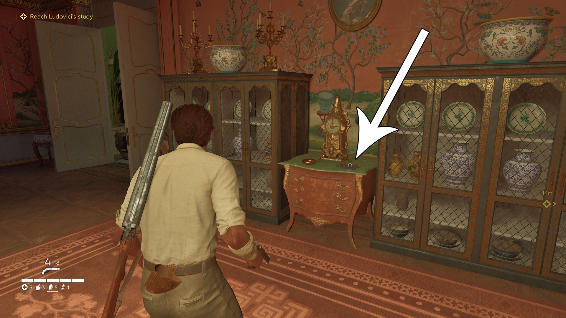 - Chapter 5 – Vendetta d’onore: W środku domu Ludovici: przejdź przez pierwszy pokój (zielone tapety), wejdź do drugiego, obróć się — na małej szafce obok złotego zegara.