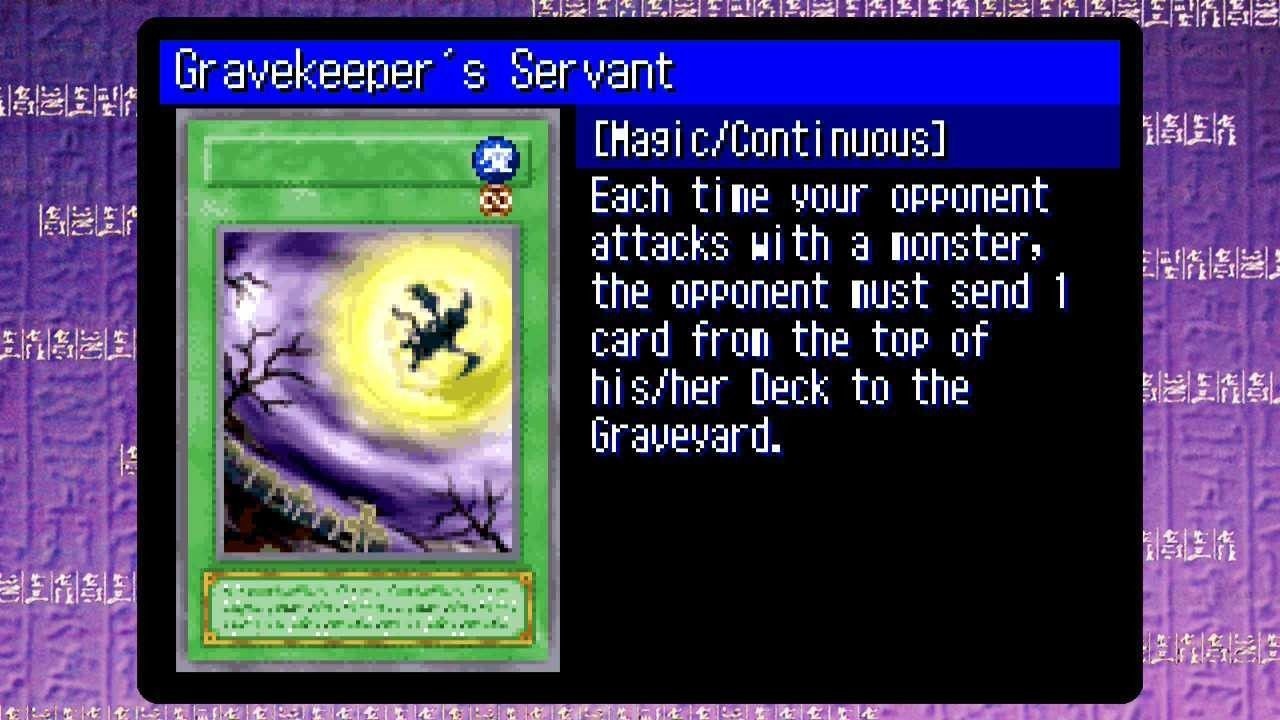 Gravekeeper’s Servant to karta, która potrafi całkowicie zmienić sposób prowadzenia rozgrywki w Yu-Gi-Oh!, ponieważ pozwala na systematyczne wyczerpywanie kart w talii przeciwnika; przez to moja strategia opiera się na zmuszaniu rywala do dobierania pustej talii i przegranej przez brak możliwości dociągnięcia karty.