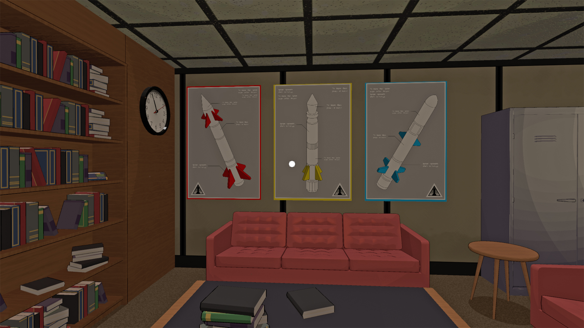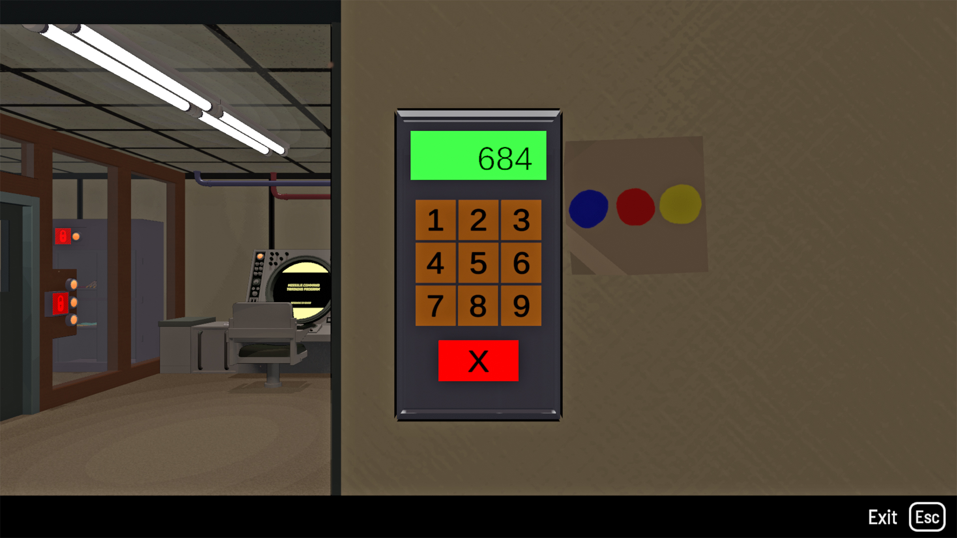 Obok klawiatury, na której wpisujesz kod, znajdują się trzy kolorowe kropki: niebieska, czerwona i żółta. To właśnie ich kolejność wskazuje, w jakim porządku musisz wpisać cyfry. Teraz spójrz za siebie na ścianę – znajdziesz tam trzy plakaty rakiet w tych samych kolorach: czerwony, żółty i niebieski.