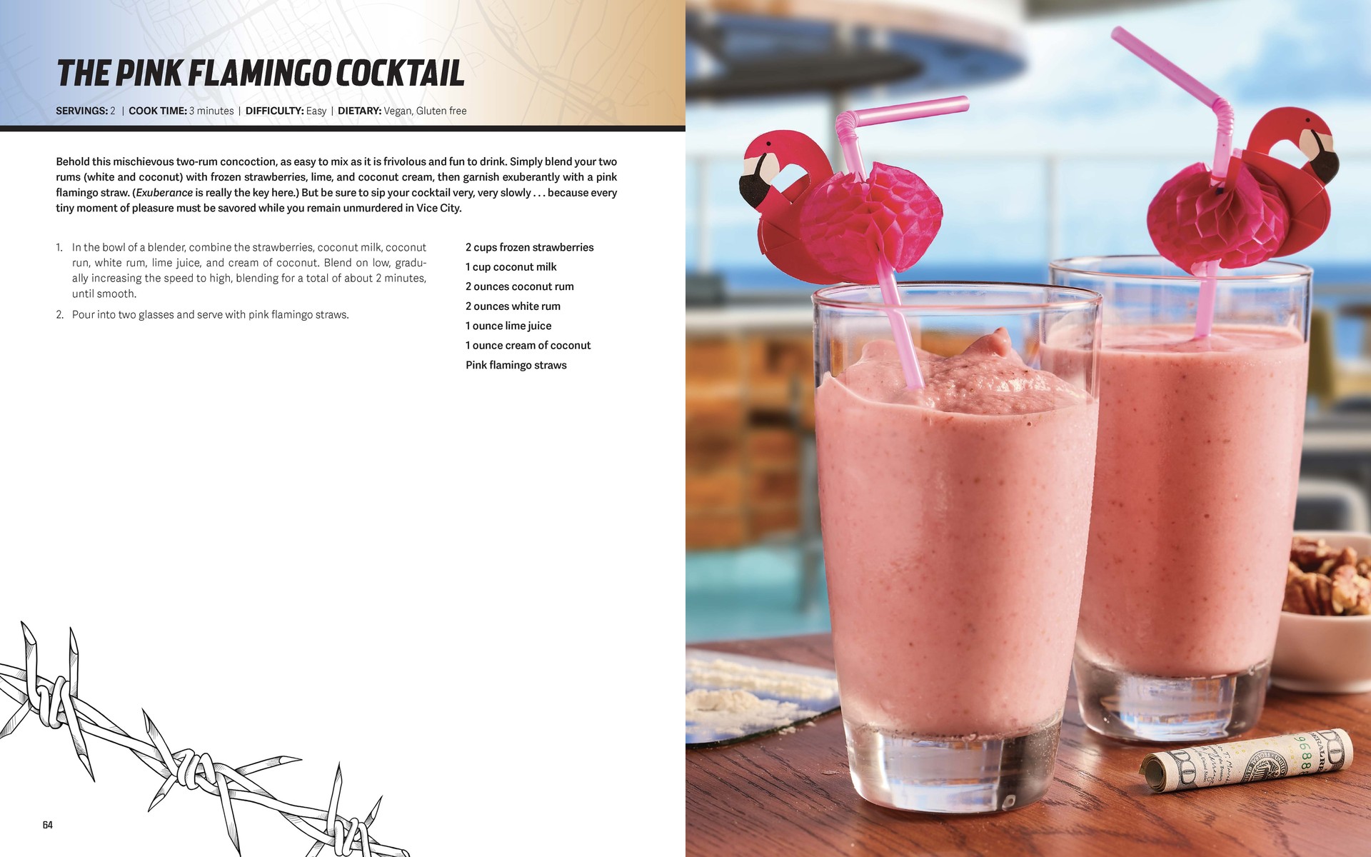 Na koniec coś dla fanów drinków – Pink Flamingo Cocktail z Benny’s Restaurant w Vice City to mieszanka mrożonych truskawek, mleka kokosowego, limonki, kremu kokosowego oraz białego i kokosowego rumu. Prosty, orzeźwiający i idealny na gorące wieczory – choć po nim zdecydowanie nie powinno się prowadzić.