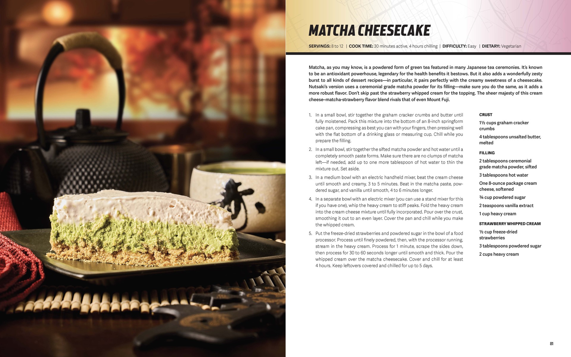 Dla łasuchów jest matcha cheesecake z lokalu Nutsaki na San Andreas Avenue w Los Santos. Do jego wykonania potrzebujesz wysokiej jakości proszku matcha, który miesza się z serkiem kremowym, cukrem pudrem i wanilią. Całość spoczywa na kruchym spodzie z herbatników, a dopełnia ją truskawkowa bita śmietana. Warto pamiętać, że ciasto wymaga kilku godzin chłodzenia, ale starcza nawet na kilka dni.