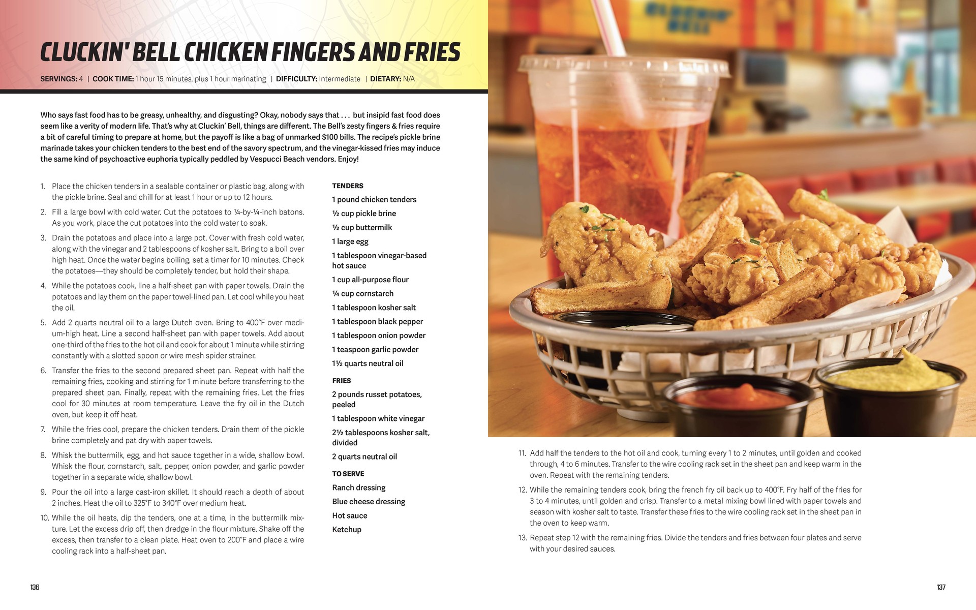 Na pewno warto spróbować słynnych kurczaków Cluckin’ Bell – ich przygotowanie wymaga namaczania mięsa w zalewie z ogórków przez 1 do 12 godzin, a następnie panierowania w maślance i ostrym sosie. Zamiast głębokiego smażenia, przepis wykorzystuje pieczenie w Dutch oven, a frytki wzbogacone są octem, co nadaje im wyjątkowego smaku.
