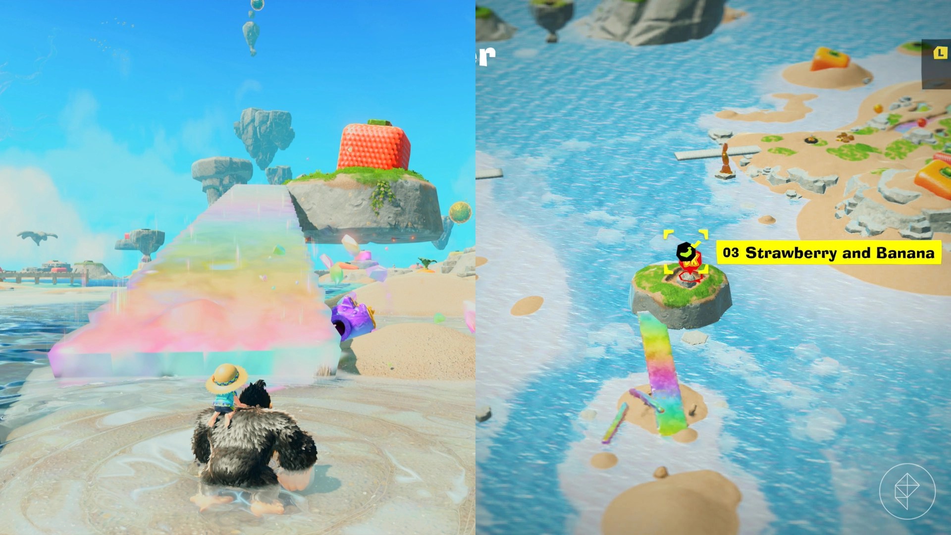 Stając twarzą do centralnego arbuza na wyspie startowej, skręć w prawo, by zobaczyć ogromną truskawkę na unoszącej się wyspie. Wykorzystaj tęczowego rekina, by stworzyć most i dostać się na wyspę. Możesz też wskoczyć na przycisk na truskawce, by zdobyć banana.