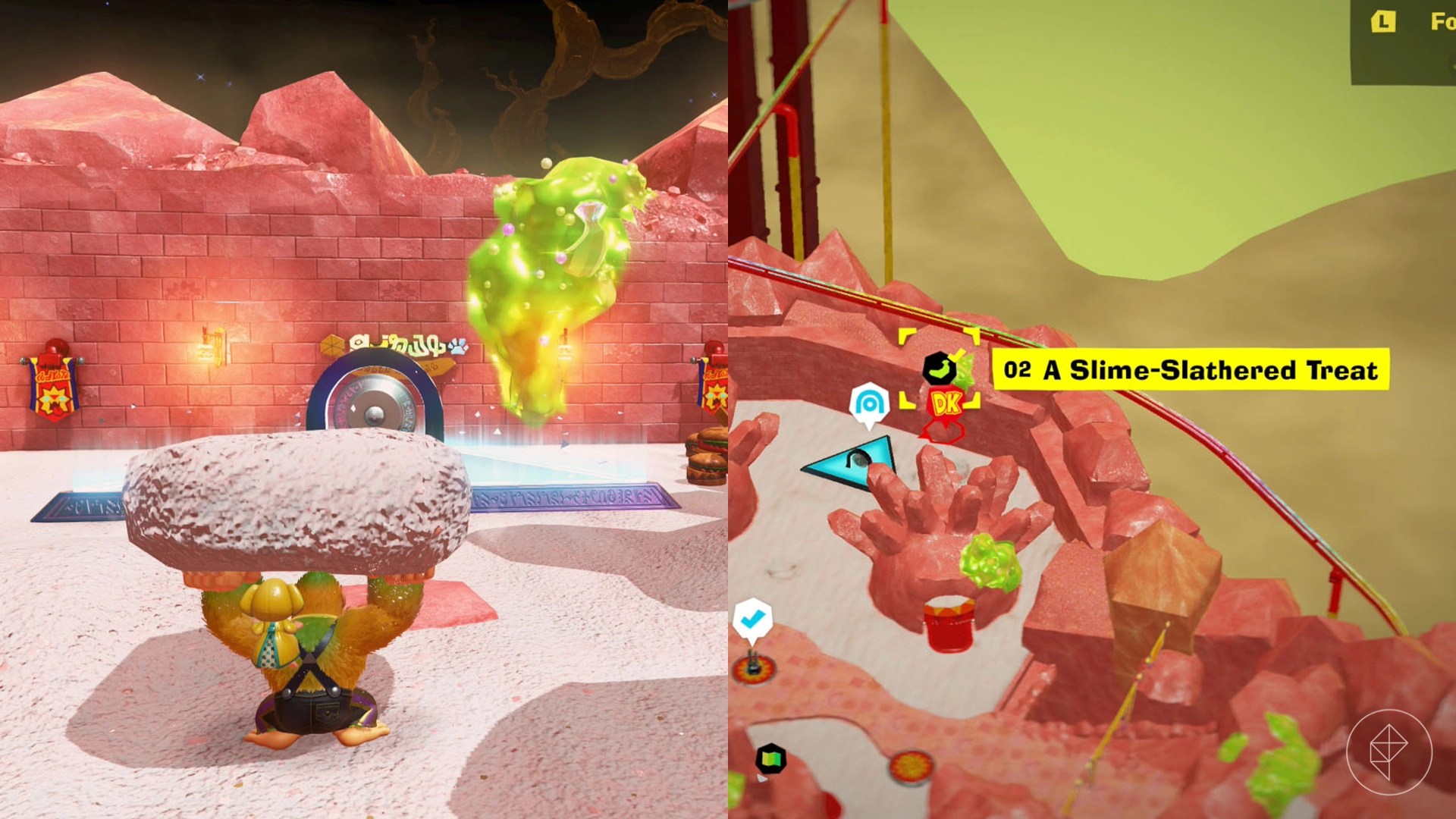 Donkey Kong Bananza zaprasza graczy do 14. warstwy gry, zwanej Feast Layer – to miejsce pełne smakowitych, choć niebananowych atrakcji. Tematycznie przypomina park rozrywki z motywem tłustego, pysznego jedzenia, a rządzą tu lwy-Fractones, rzeki gorącego oleju i słone piaski. Nie zabrakło też zielonego, nieprzyjemnego mułu oraz oczywiście – Banandium Gems, czyli cennych bananowych kryształów.