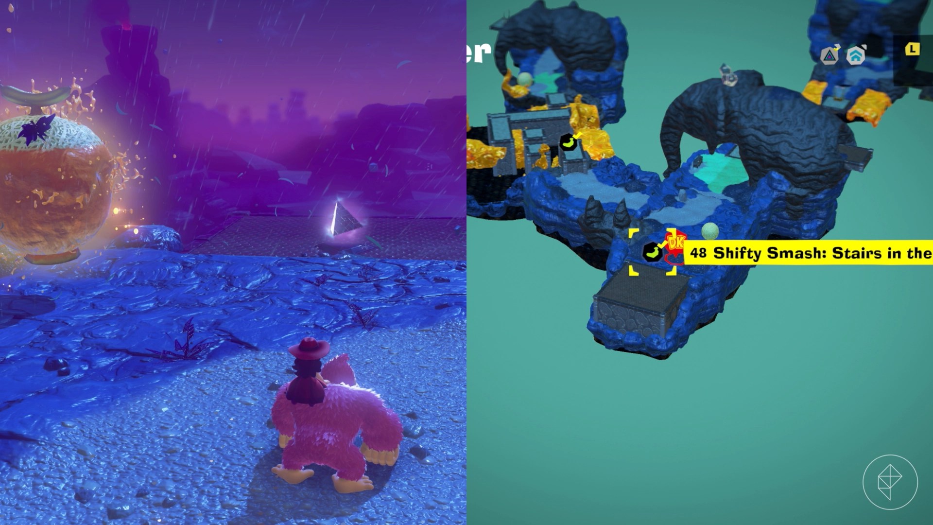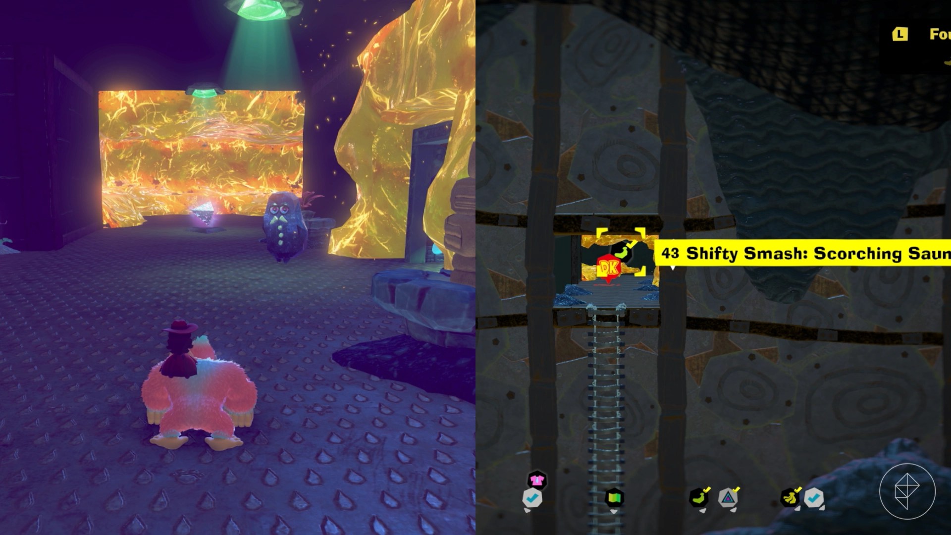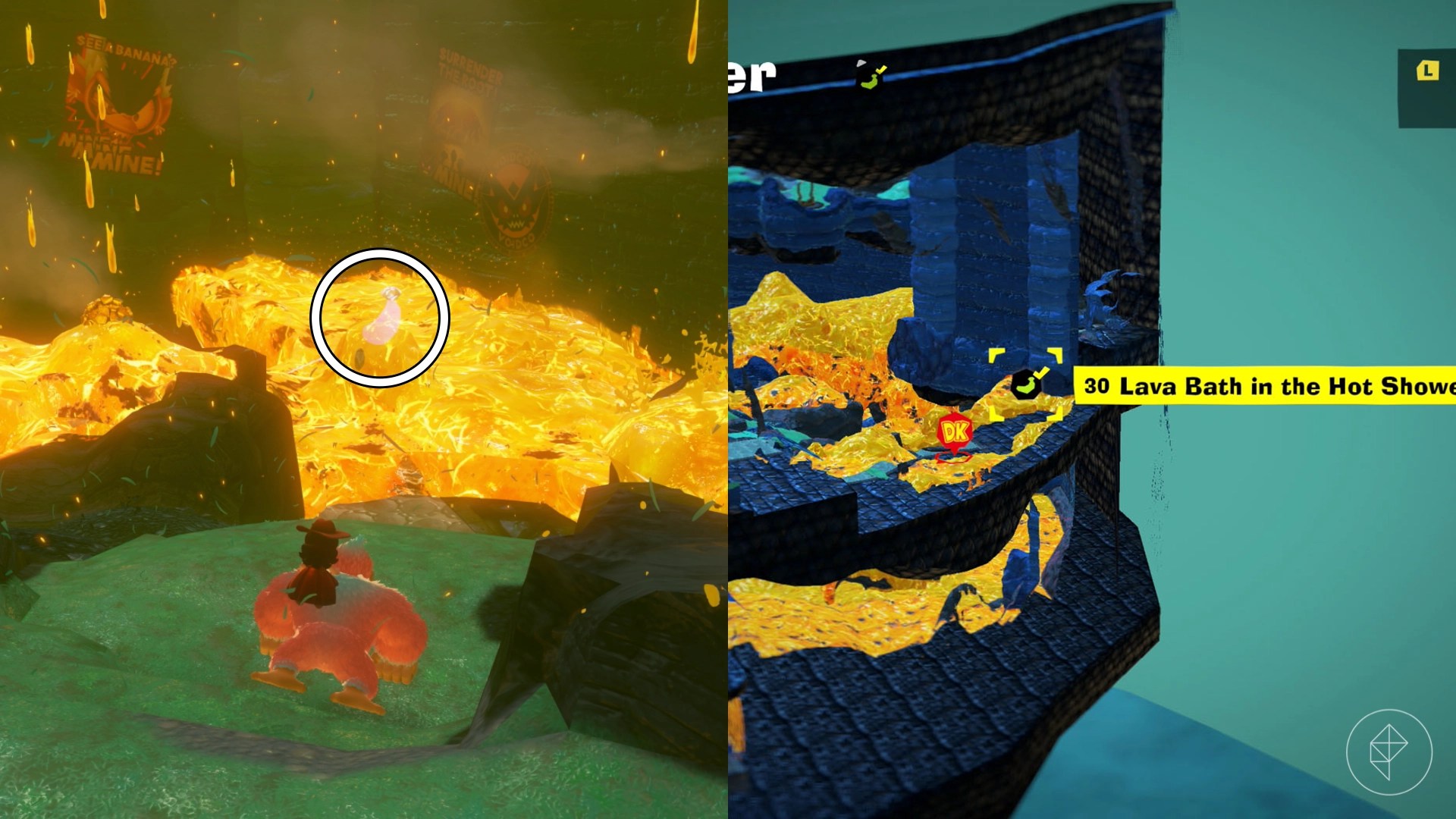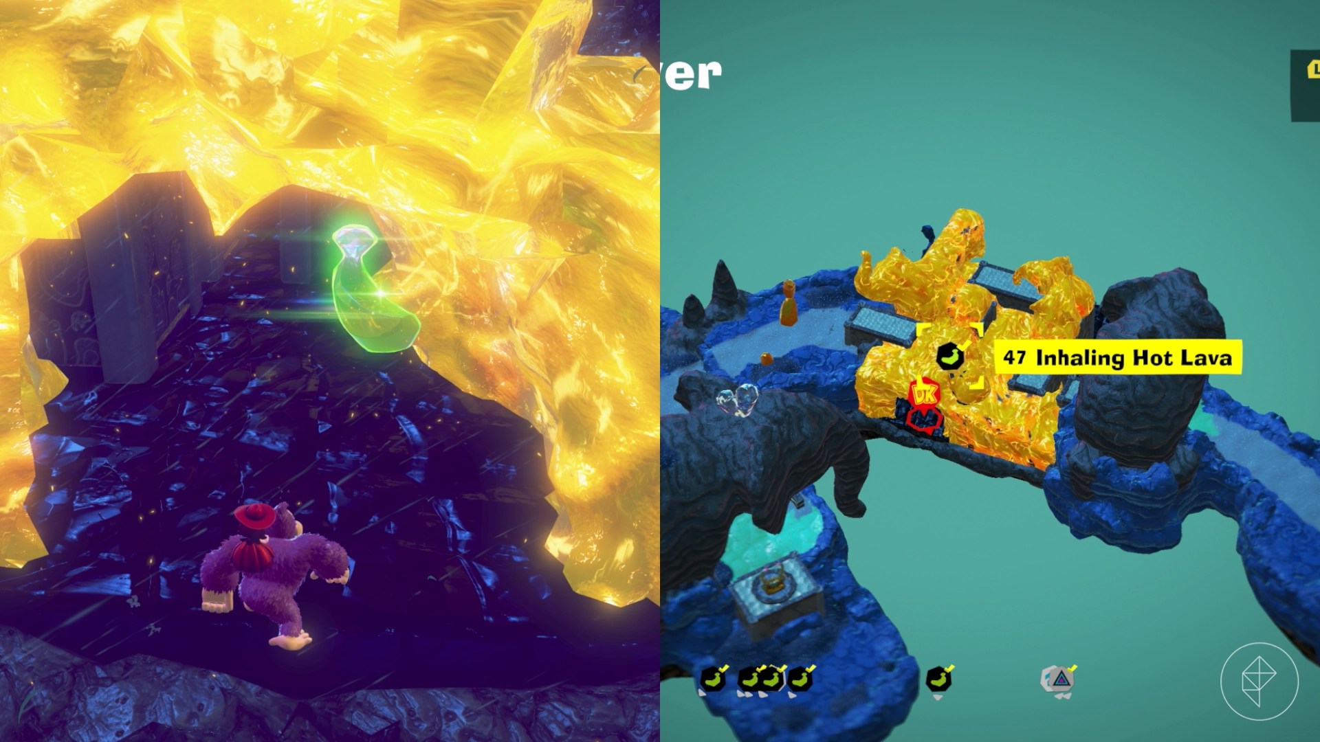 W podziemnych tunelach za Void Machine znajdziesz kolejne ukryte miejsca z bananami, a w arenie Blusterwinga użyj mocy Elephant Bananza, by usunąć lawę i dostać się do sekretnego banana.