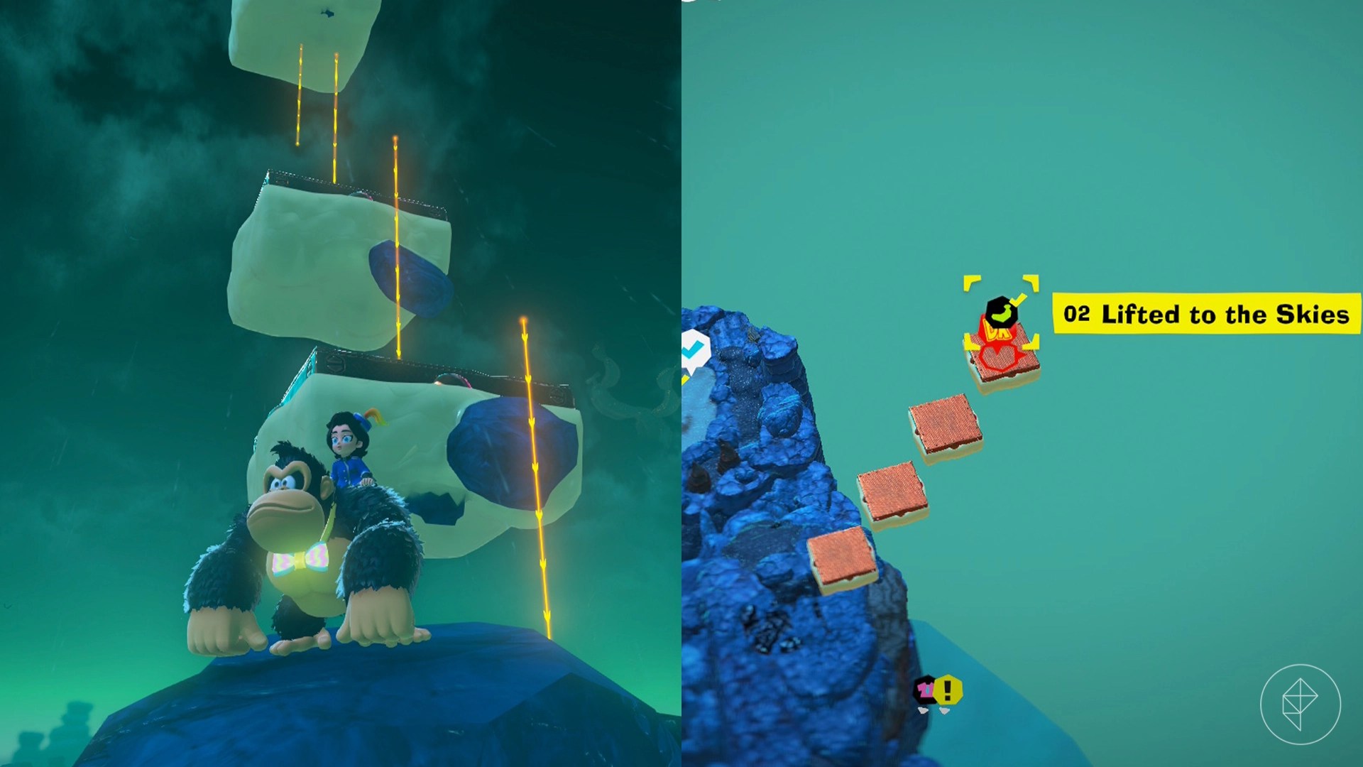 Na początek, po zniszczeniu dużego arbuza w Resort Layer, spadnij w dół, by znaleźć pierwszą grupę bananów. Następnie wspinaj się na kamiennego słonia po lewej stronie wejścia – tam złote linie pokazują ścieżki chmur, na których możesz manipulować platformami, obniżając je i podnosząc ręką. To wymaga trochę wprawy, ale możesz też poczekać na Elephant Bananza, by ułatwić sobie zadanie.
