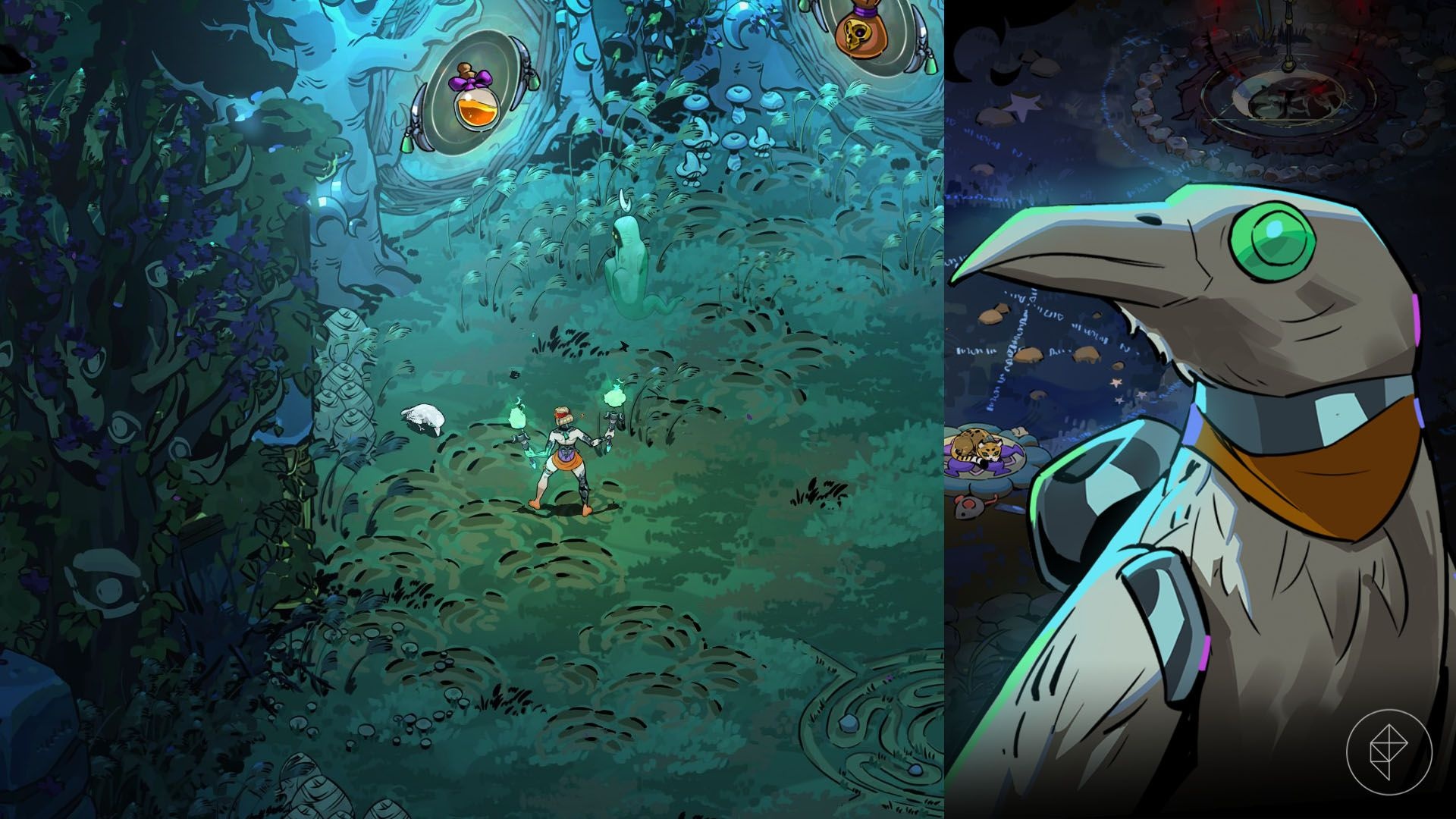 Następnie znajdziesz inkantację przy Kadzi (Cauldron). Można ją odblokować wydając 1 lotus oraz 2 nectar. Po odblokowaniu, podczas biegów spotkasz poszczególne zwierzaki — wystarczy dać im witch’s delight, żeby zaprosiły cię z powrotem do Crossroads.