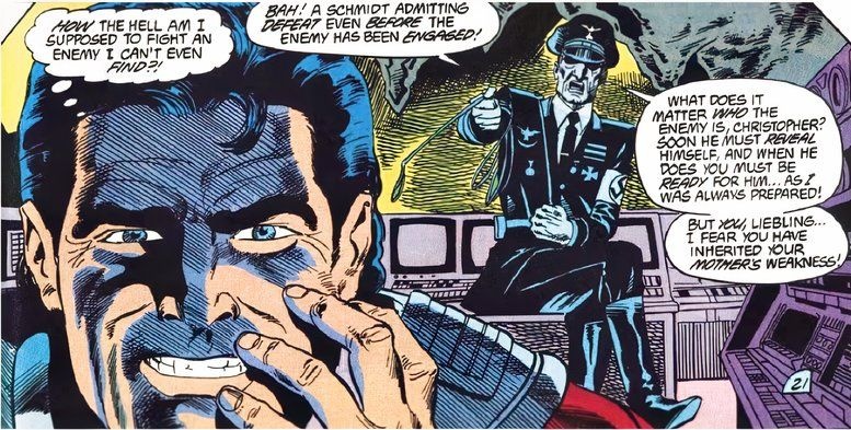 W komiksowej historii z końca lat 80. Christopher Schmidt urodził się w 1951 roku w Austrii; jego ojciec, Wolfgang Schmidt, był funkcjonariuszem S.S. i odpowiadał za masowe zbrodnie. Kiedy prawda wyszła na jaw po wojnie, Wolfgang odebrał sobie życie w dniu piątych urodzin Chrisa. W tej wersji traumy ojcostwa manifestują się jako halucynacje — ojciec w mundurze S.S. ciągle krytykuje Chrisa i zachęca do bezwzględności. James Gunn zaadaptował ten motyw, ale dostosował go do współczesnego kontekstu: zamiast nazistowskiego oficera powołał postać Auggie’go Smitha jako przywódcę amerykańskiej organizacji białej supremacji, Aryan Empire.
