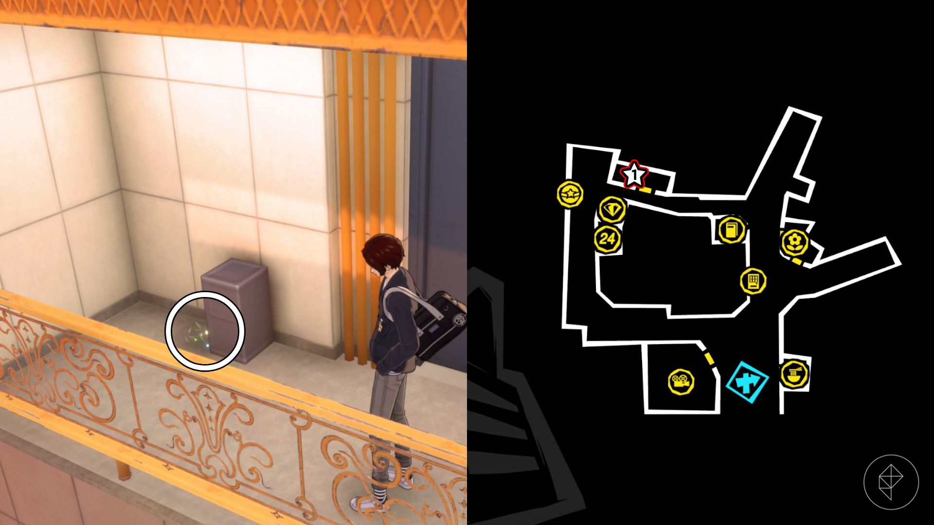 Pierwszy skarb znajdziesz, wchodząc po schodach na północny wschód od sklepu jubilerskiego. Rozglądaj się za szarym koszem, obok którego czeka na Ciebie Orange Tabby Treasure.