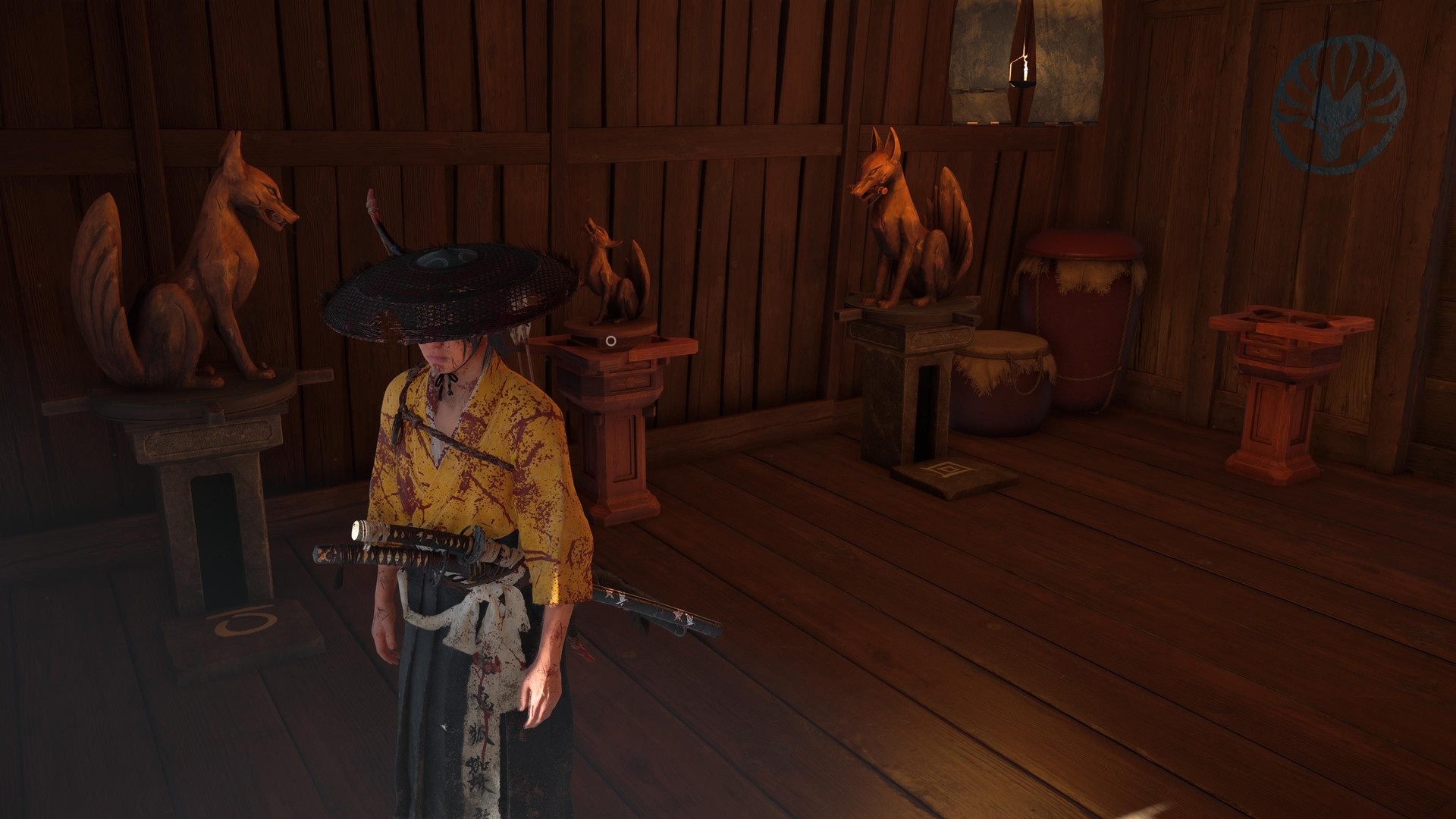 W środku podstawy latarni zobaczysz cztery duże posągi lisów, każdy z symbolem z przodu, dwa mniejsze posążki lisów oraz dwa puste piedestały przed drzwiami. Drzwi mają własny symbol, który nie pasuje do symboli przy dużych posągach. Jednak symbole nie mają znaczenia dla rozwiązania.