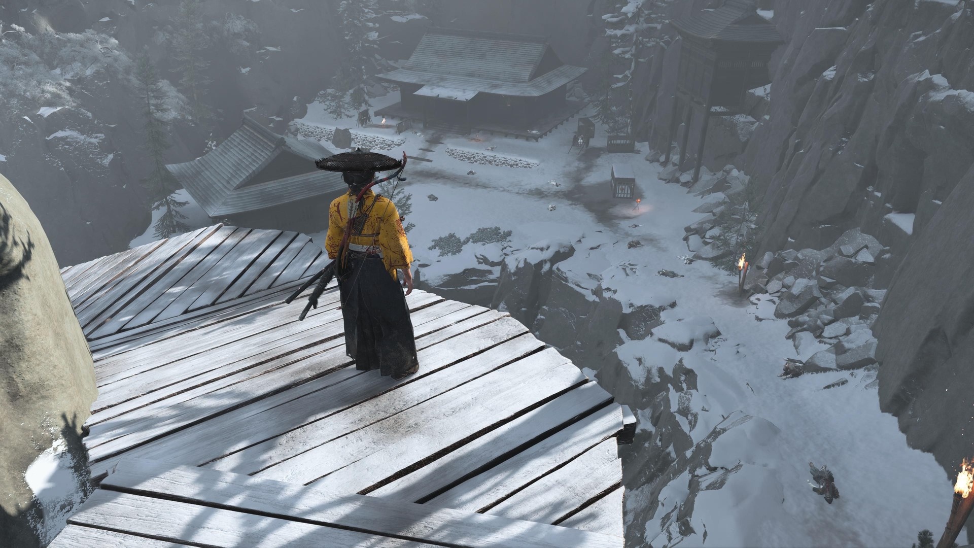 Otworzenie drzwi nie daje typowego łupu. Zamiast tego otrzymujesz dostęp do ścieżki za latarnią, która prowadzi w dół przez kilka lekkich sekcji platformowych. Po zejściu na dół Atsu zauważa ciała myśliwych na ścieżce — to fakt, a nie walka.