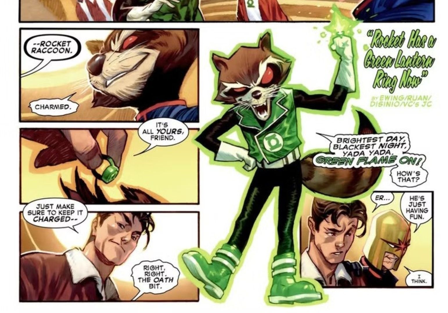 W scenie przekazu Hal mówi: „Najjaśniejszy dzień, najczarniejsza noc. Yada yada. Zielony płomień, w górę!” Rocket zakłada kostium podobny do tego z szafy Guy Gardnera i… robi to po swojemu. Nie zaczyna patrolować kosmosu. Zamiast tego obstawia pierścień w kasynie, a potem kasyno okrada.