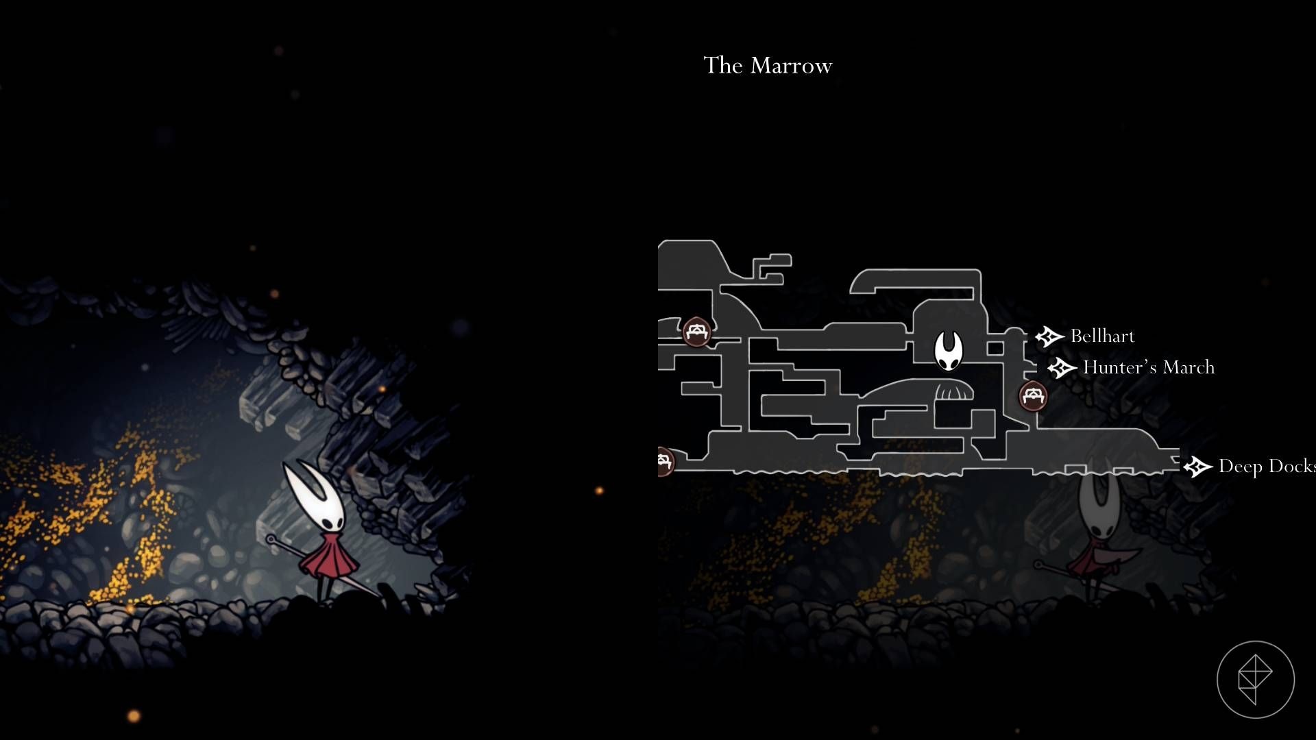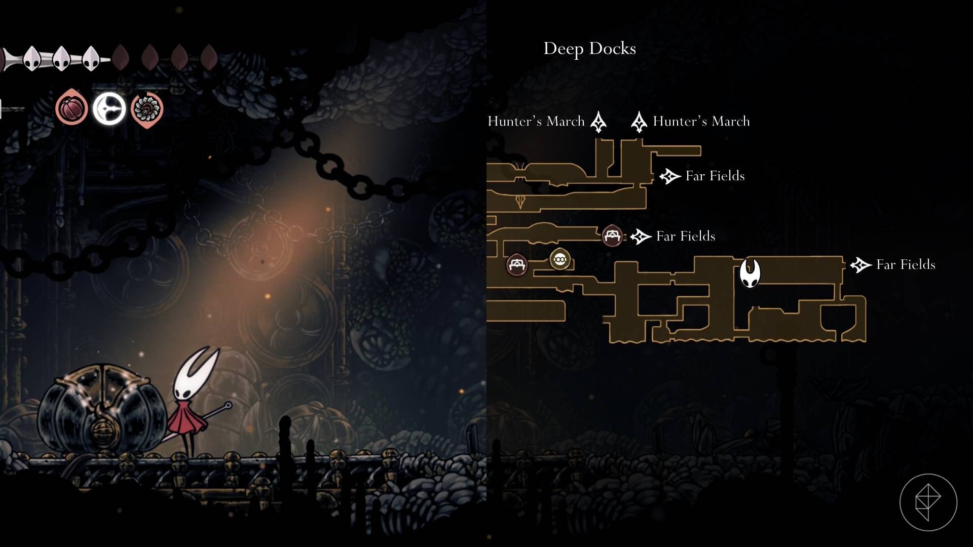 Wejdź do Deep Docks przez dolne wejście z Far Fields. Zamiast zeskakiwać po spool fragment, idź w lewo. Po drodze rozbij drewniane belki pod platformą, wejdź do następnej komnaty i otwórz skrzynię — tam znajduje się craftmetal. Ponadto przy wejściu pojawi się latający przeciwnik rzucający materiały wybuchowe, więc zachowaj ostrożność.