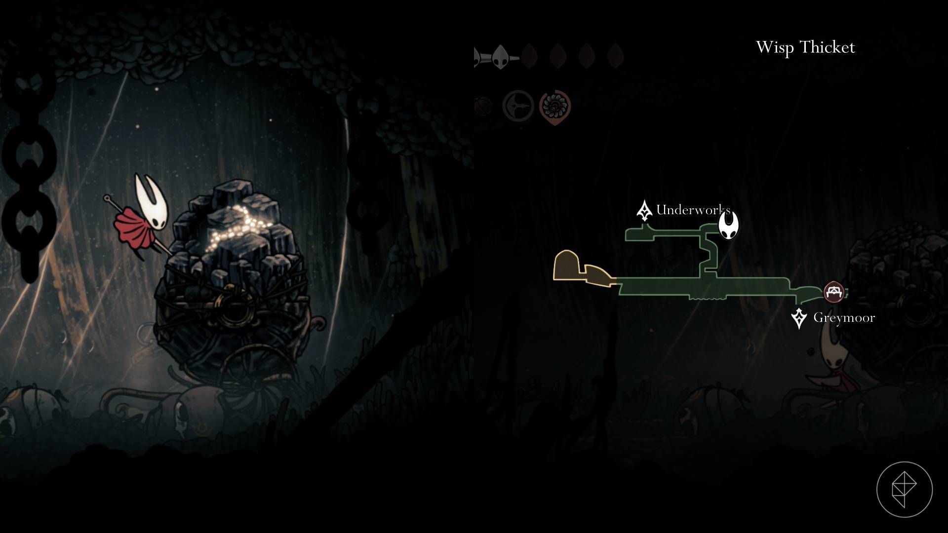 Dostęp do Wisp Thicket wymaga Clawline i Faydown Cloak. Wejdź na wieżę przy Halfway House, wyjdź przez górne lewe wyjście i przejdź przez kolce. Na lewym końcu użyj Faydown Cloak, aby podwójnie skoczyć do pionowego przejścia i podążaj dalej. Najpierw idź w prawo, żeby odblokować ławkę, potem wróć i przejdź w lewo. Spotkasz płonącego robaka, który strzela śledzącymi kulami ognia — możesz go ominąć. Gdy dojdziesz do wody, poruszaj się w górę, wejdź do sekretnego wejścia w lewym górnym rogu i idź w prawo: craftmetal jest na końcu korytarza.