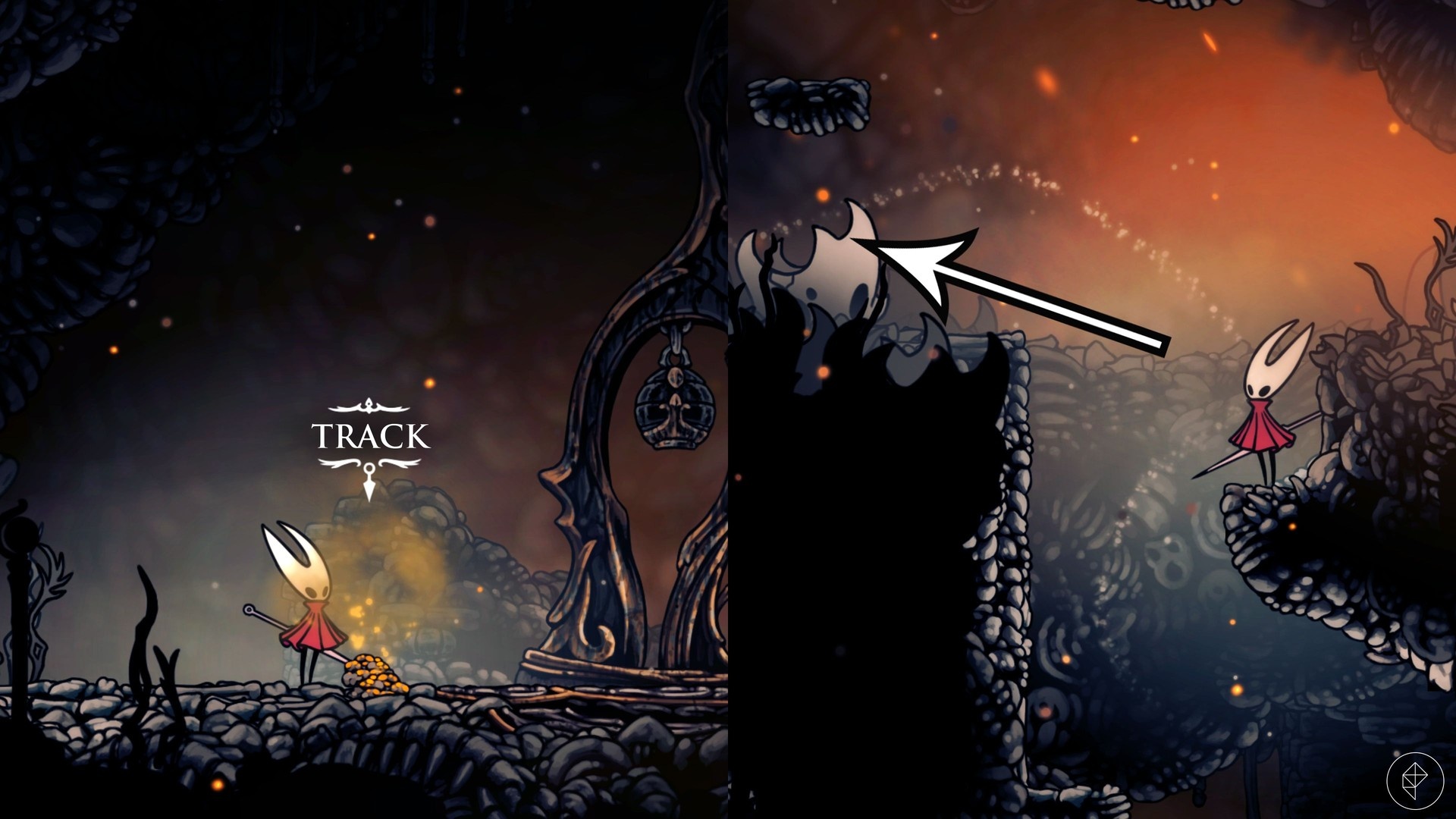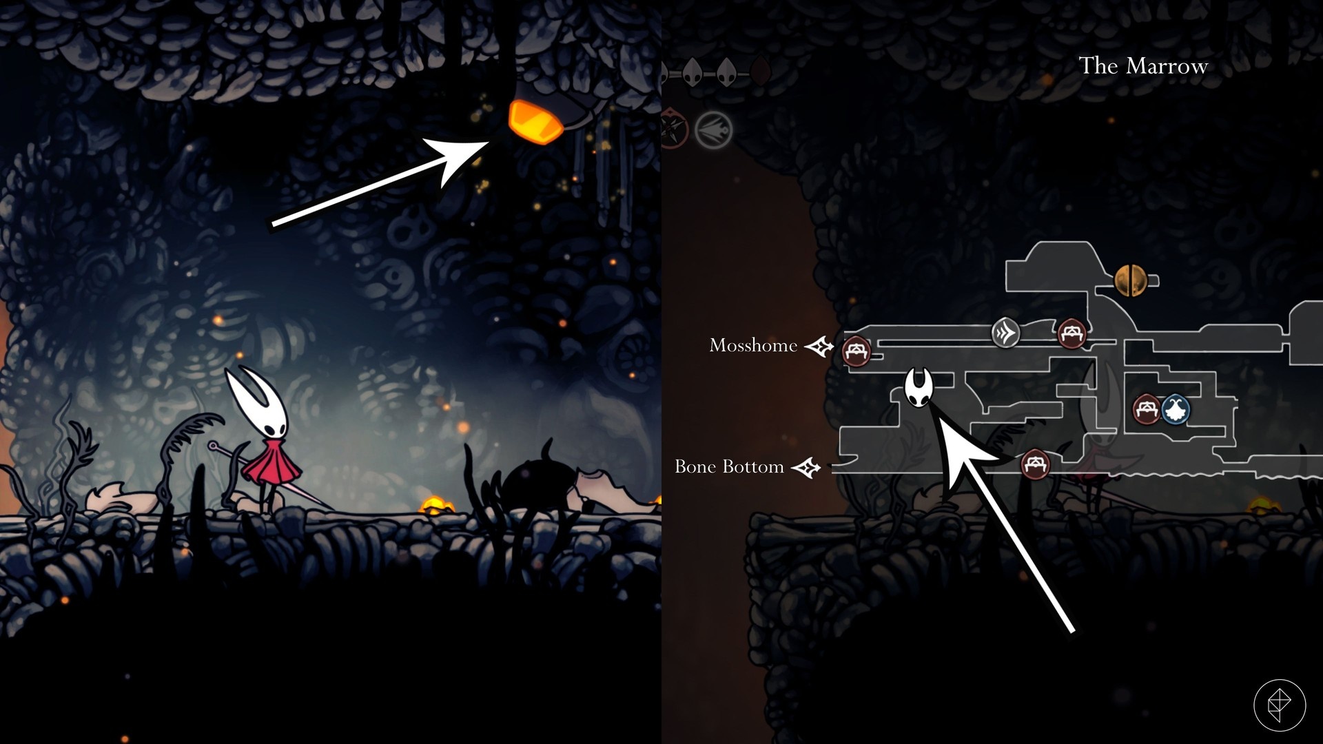 Pierwszy Volatile Flintbeetle znajduje się na szczycie pierwszego pomieszczenia, które napotkasz wychodząc z Bone Bottom w stronę The Marrow. Skocz w górę przy pierwszej okazji i idź aż do sufitu. Trafisz na świecący kamień — uderz go, żeby zrespawnować żuka.