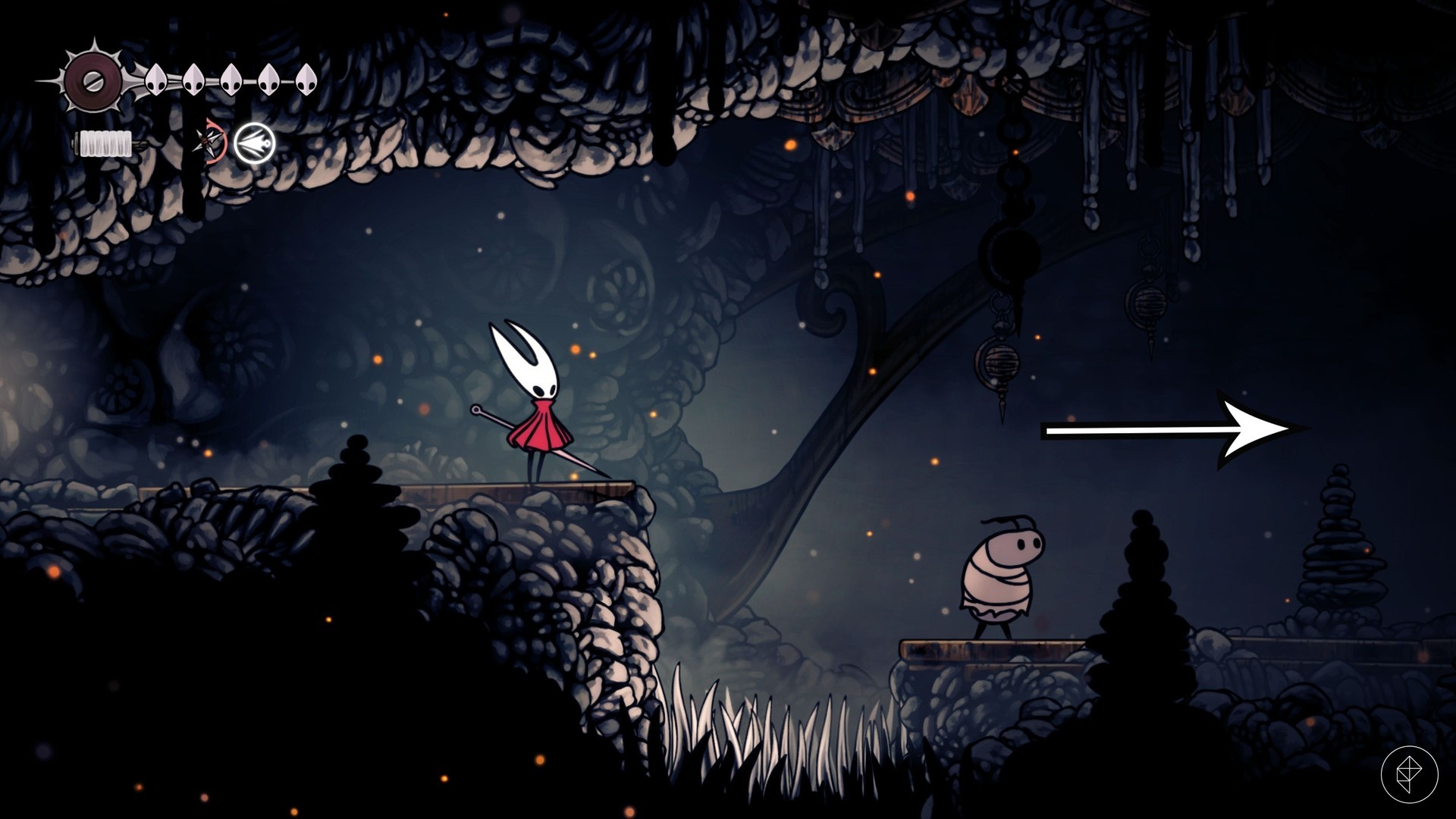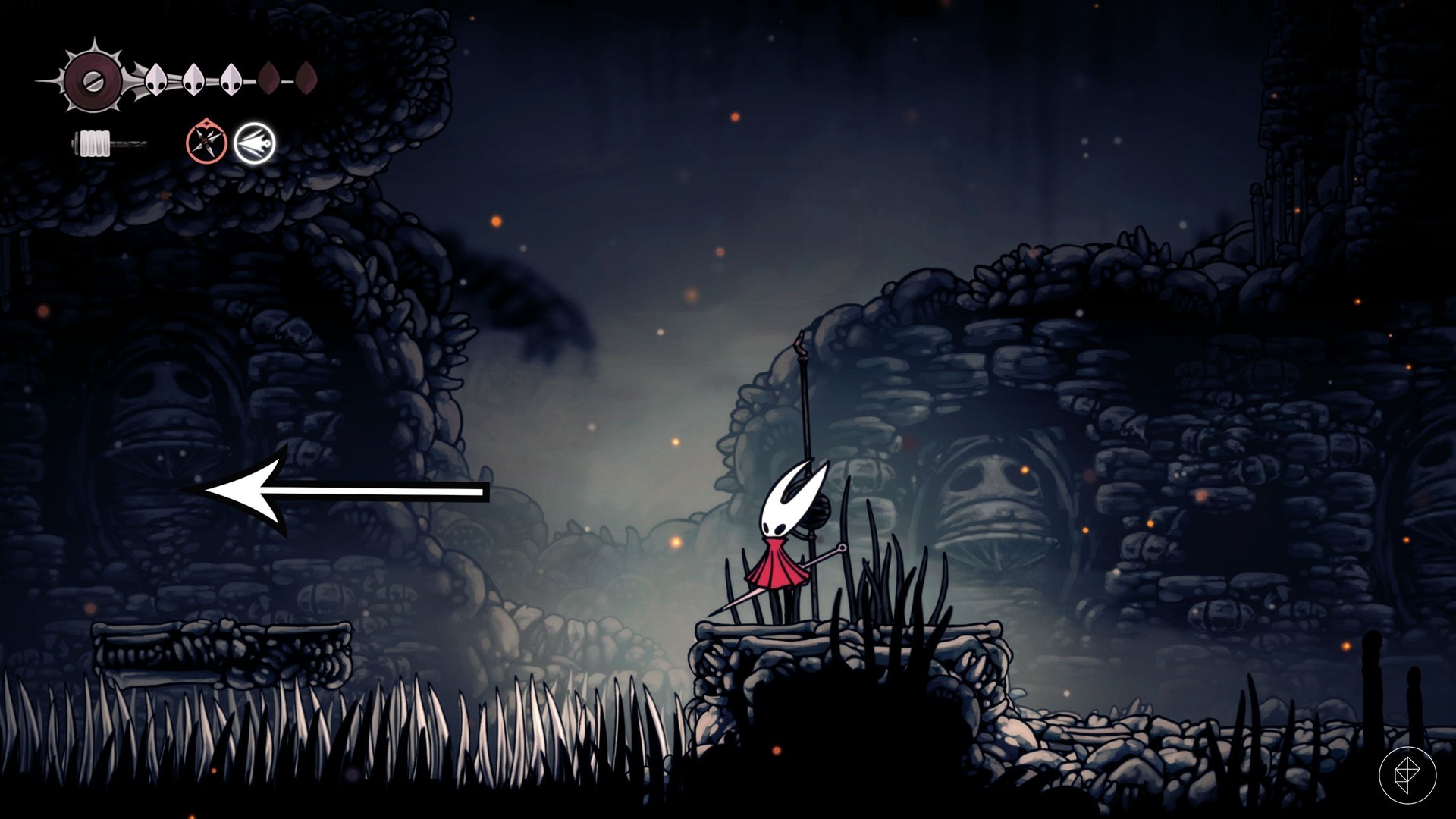 Jeśli masz problemy z wykorzystaniem ciosu w dół, rozważ użycie Reaper Crest (do zdobycia w Chapel of the Reaper na zachodzie Greymoor) lub Wanderer Crest (dostępny w Bonegrave). Oba ułatwiają pogo i mogą uchronić przed koniecznością powtarzania prób.