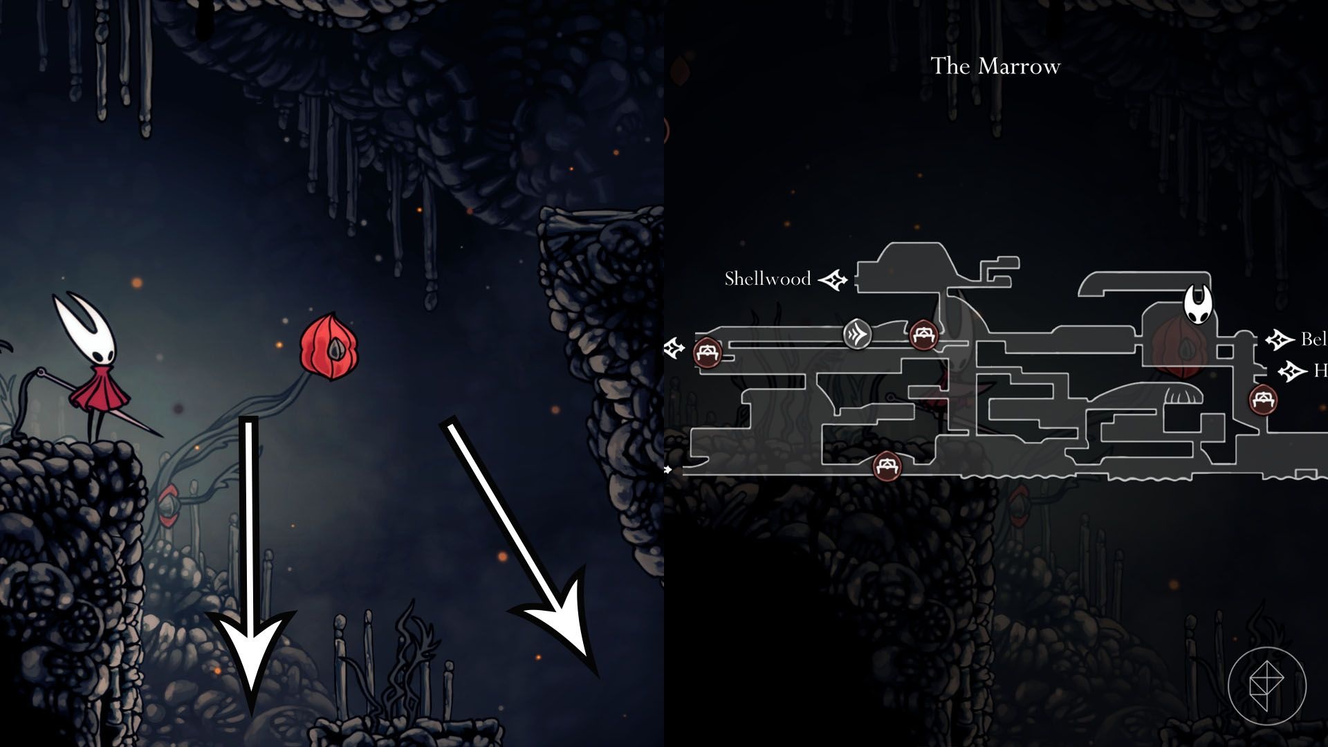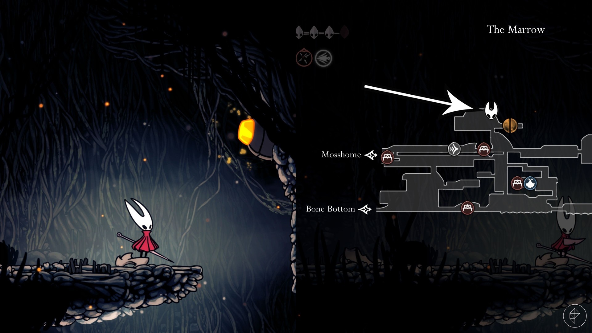 Startując od stacji szybkiej podróży The Marrow idź na wschód. Po dwóch pomieszczeniach znajdziesz duże pomieszczenie z znikającymi platformami. Skocz w górę w kolejnym pokoju — żuk znajduje się po prawej stronie u góry.