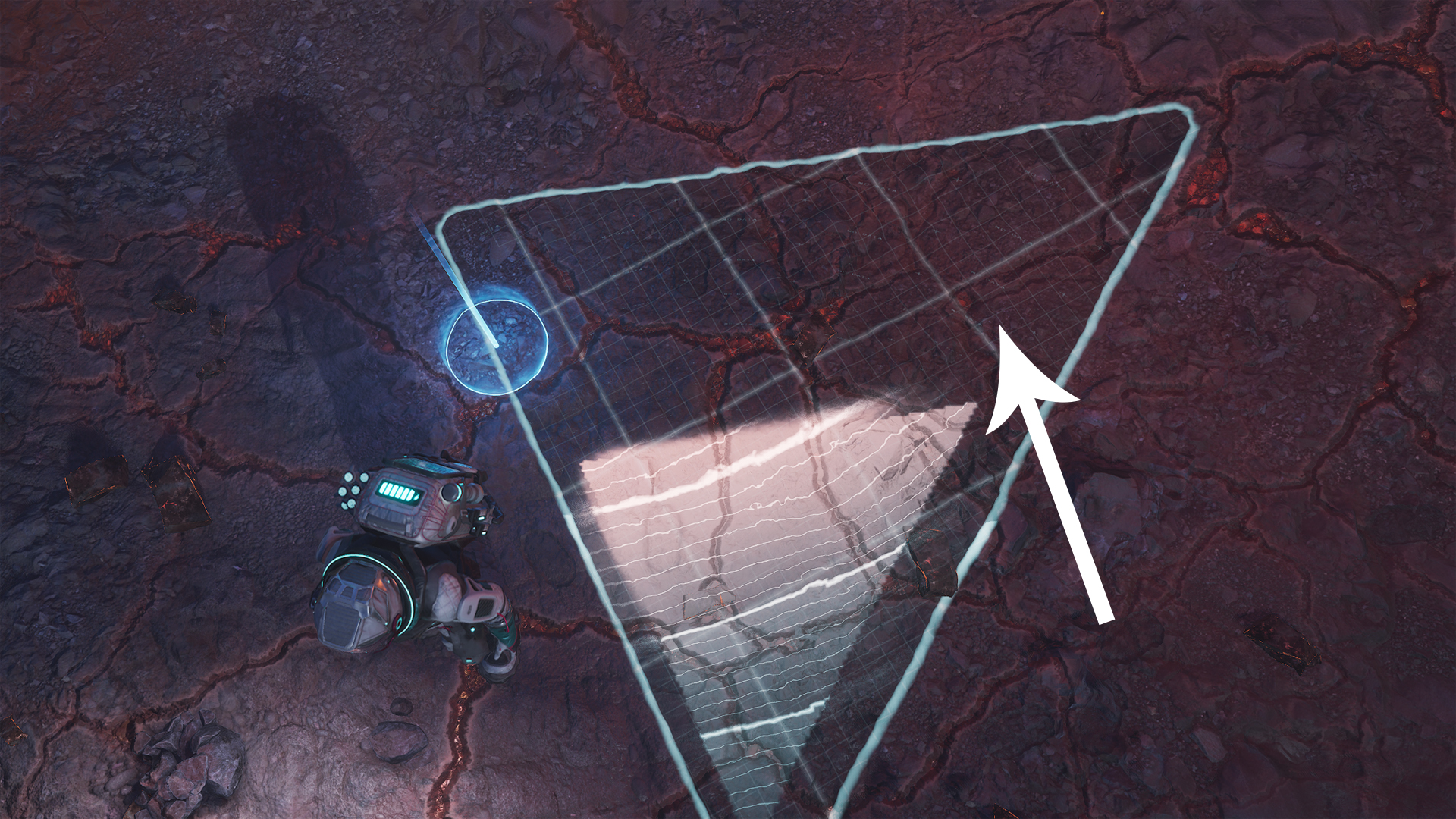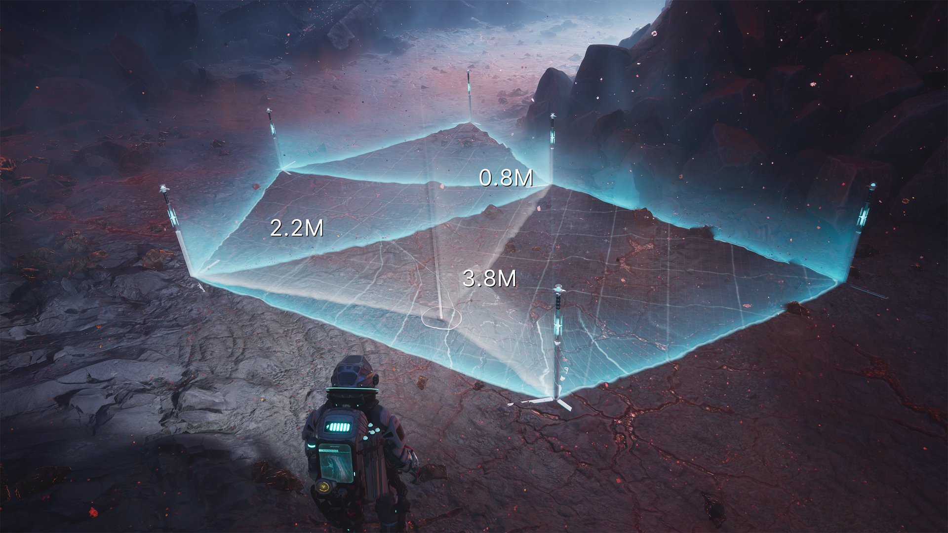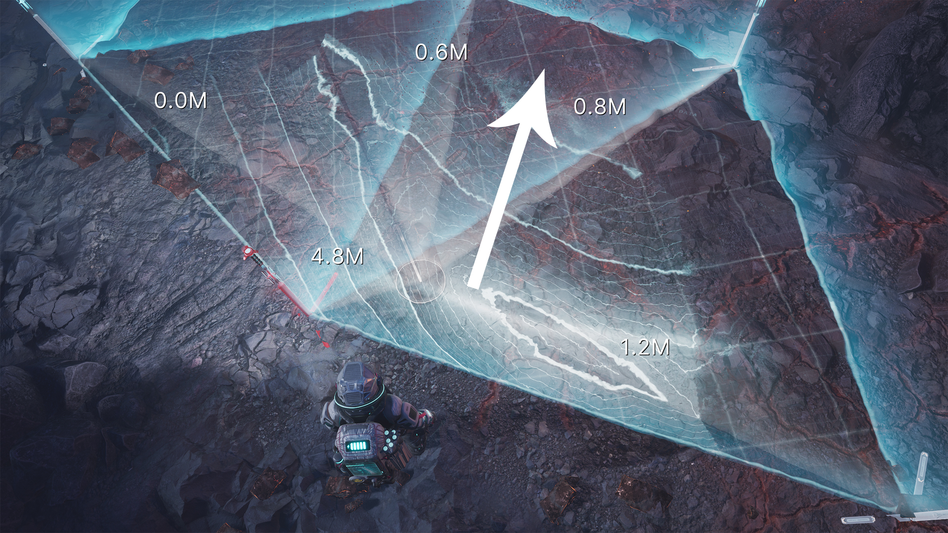 Kiedy już jesteś gotowy, rozstaw do sześciu Polygonal Scanners w okręgu wewnątrz złoża. Skanery automatycznie prześwietlą ziemię pod sobą. Jeśli od razu trafisz w najgłębszy punkt złoża, system wskaże Ci miejsce na Mining Outpost – prosto, szybko i wygodnie!