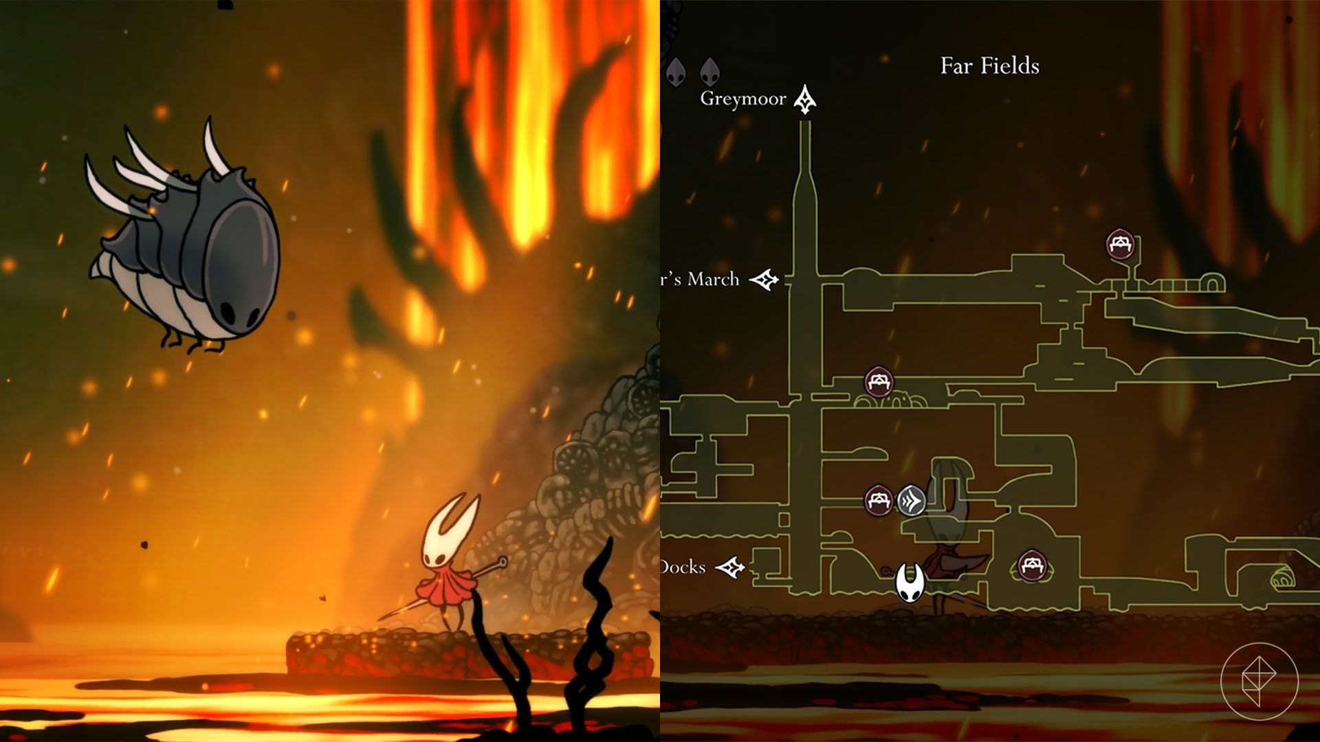 W prawym dolnym rejonie Far Fields znajdziesz zawieszone pierścienie i dom. Wciągnij się Clawline, wejdź do domu i zrzuć się w dół — czeka na ciebie trudny gauntlet z lawą. Przyda się Cogfly oraz Magma Bell na wypadek upadku.