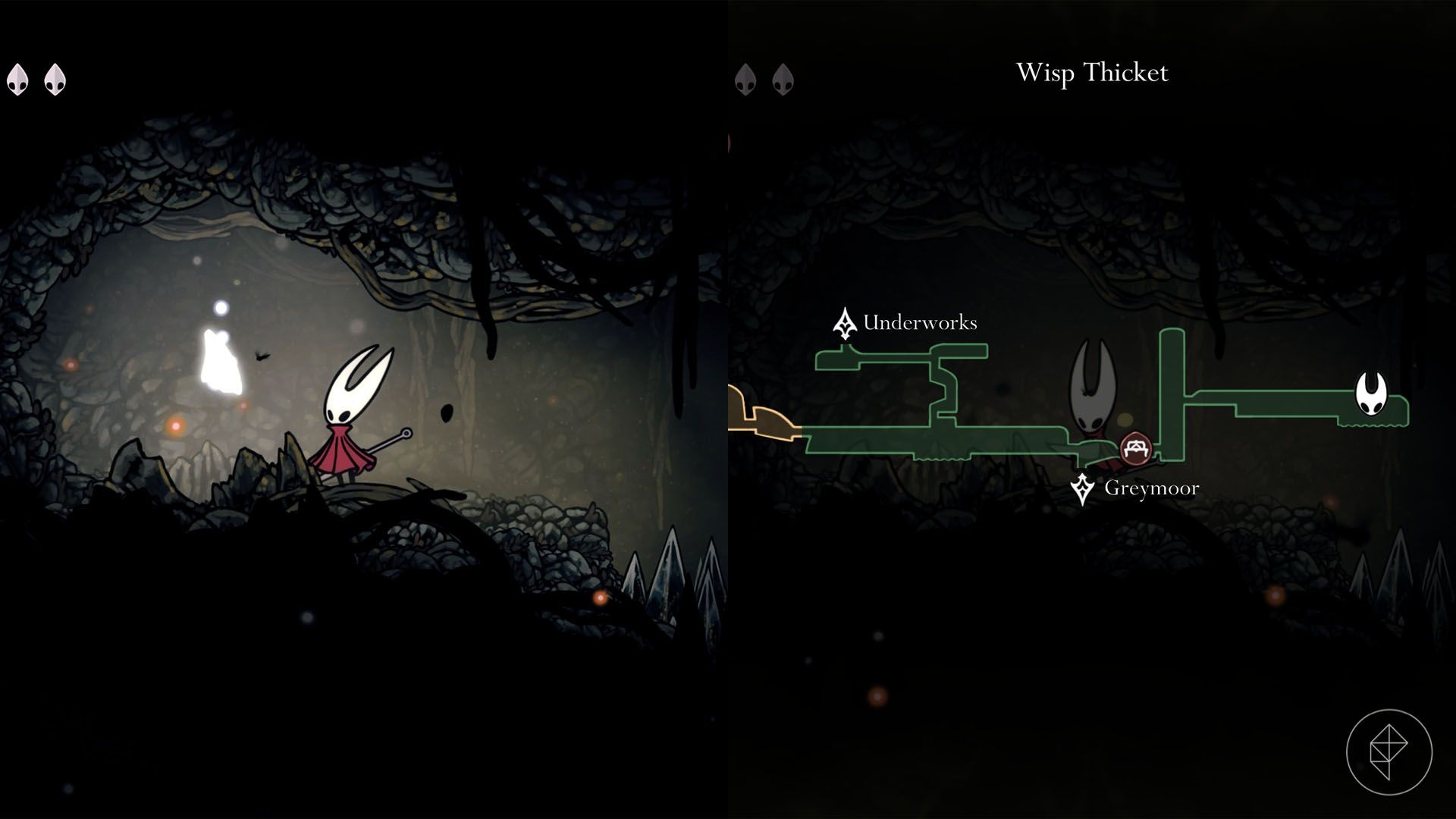 Wejście do Wisp Thicket jest w lewym górnym rogu Greymoor. Wpierw odblokuj Faydown Cloak. Następnie użyj pogo i Clawline, przejdź przez balony i ścieżkami po bokach — odłamek znajduje się na końcu.