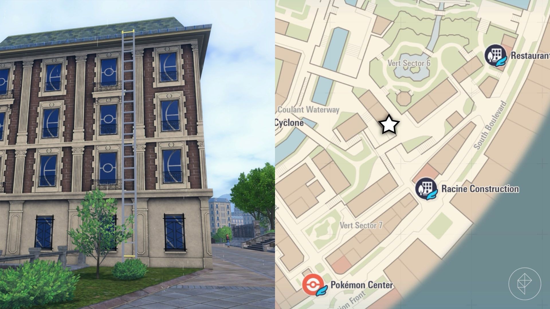 Wspięcie się na dach i przejście do jego końca pozwoli ci natknąć się na niebieskie Flabébé obok krzewów. Krótko: dachy przy Racine Construction to miejsce, w którym warto się rozejrzeć.
